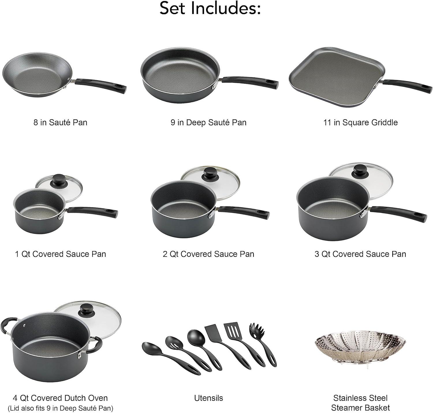 Complete Cookware Set: Includes 8 inch sauté pan, 9 inch deep sauté pan, 11 inch griddle, 1 quart sauce pan with lid, 2 quartt sauce pan with lid, 3 quart sauce pan with lid, 4 quart Dutch oven with lid (fits 9 inch deep sauté pan), stainless steel fold-up steamer, solid spoon, slotted spoon, solid turner, slotted turner, pasta spoon, and ladle.
