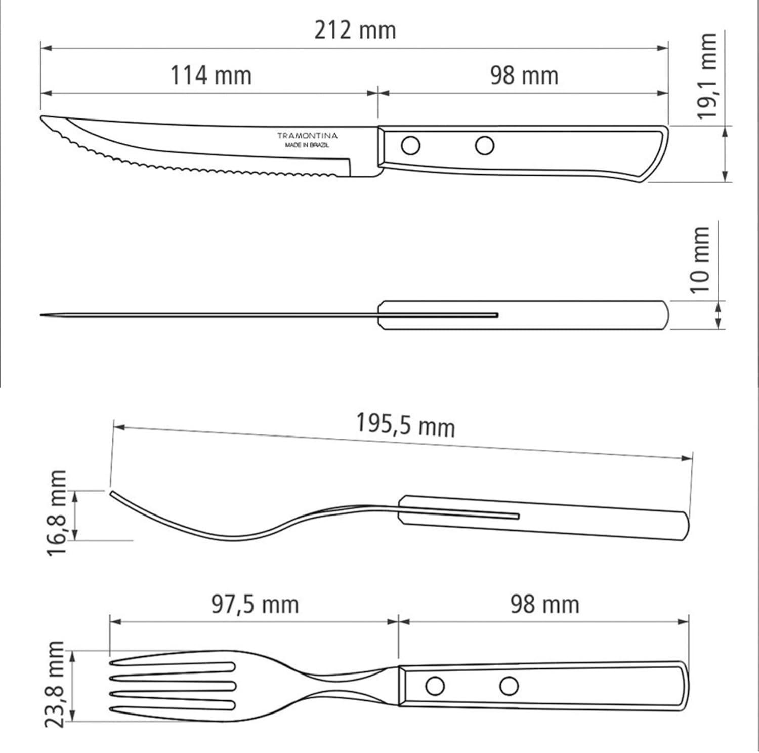 Size: Steak knife: Total length 8.3 inches (21.2 cm), Fork: total length 7.7 inches (19.5 cm)