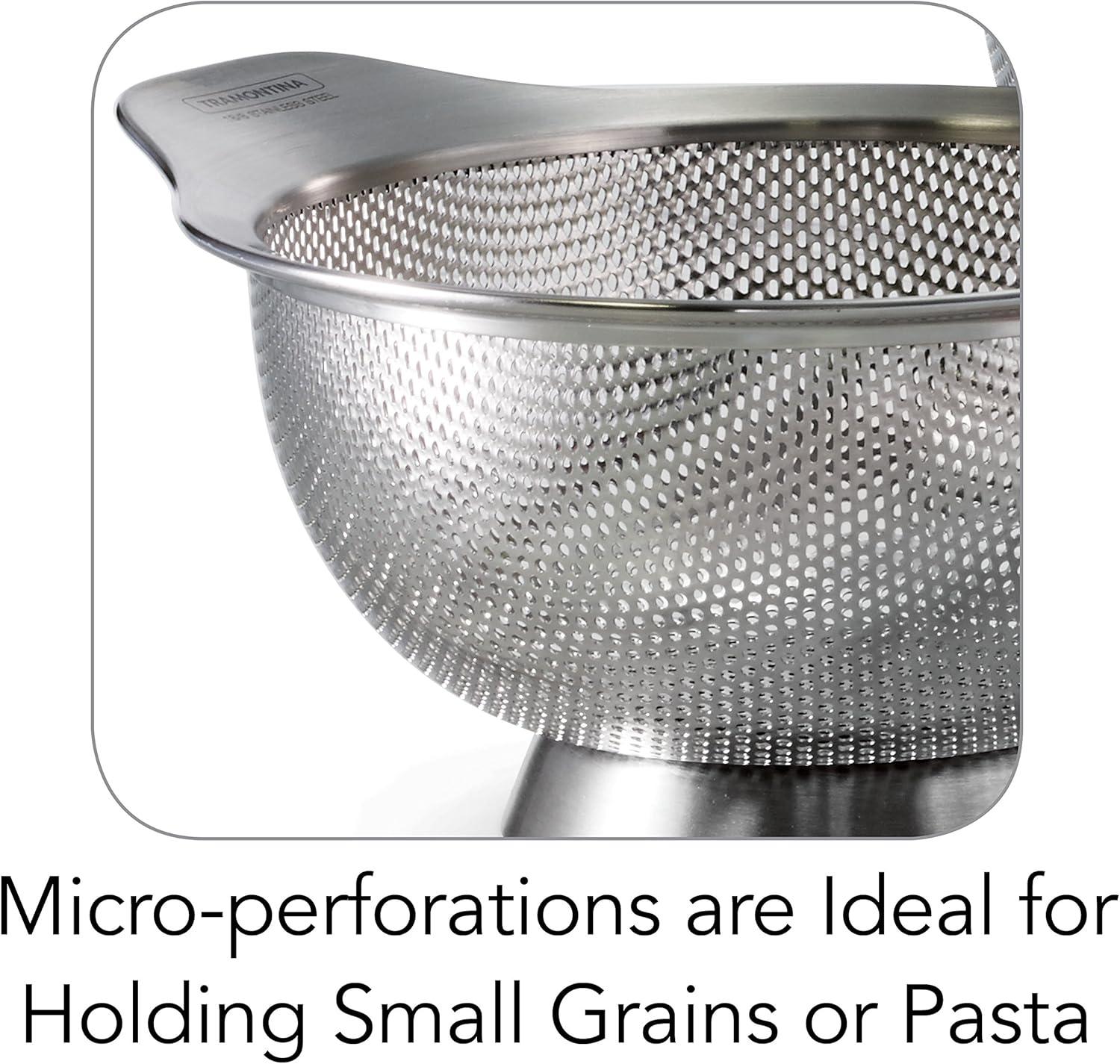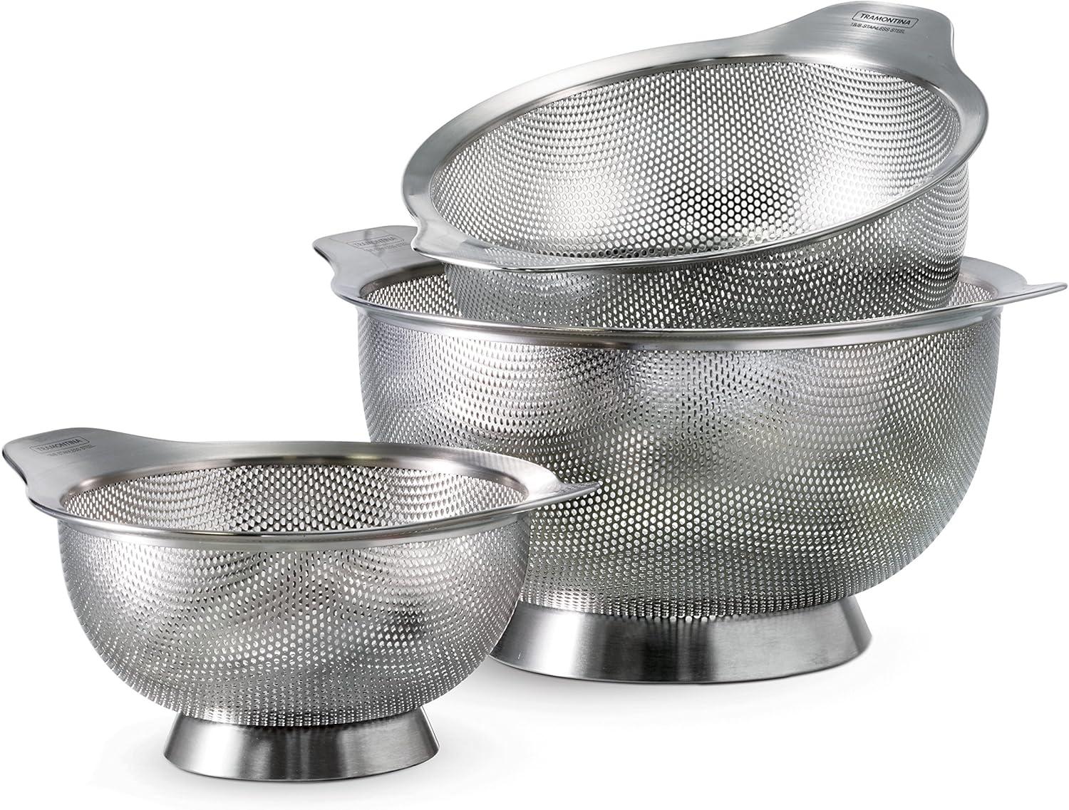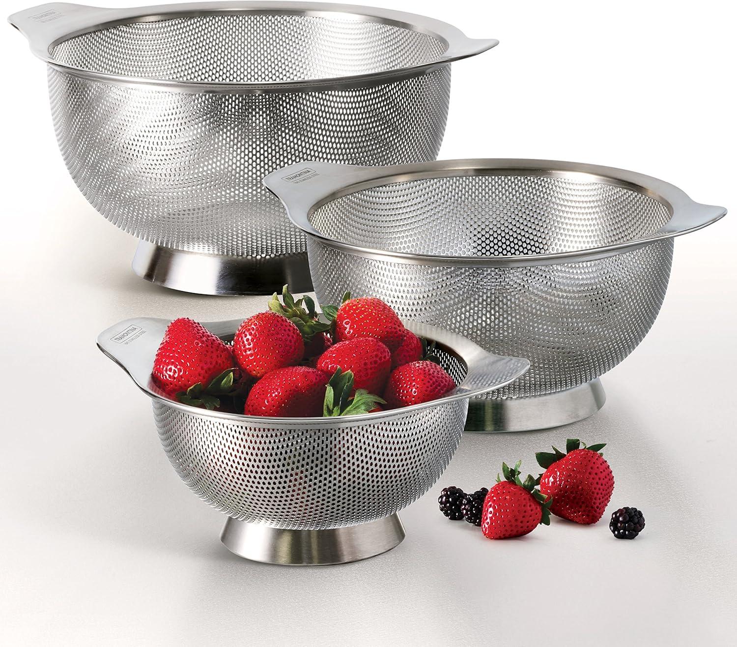 Tramontane gourmet 3 Pk colanders are elegant and durable kitchen accessories designed to make food preparation easy. The colanders are made with 18/8 Stainless Steel and feature micro-perforations that are ideal for holding small grains or pasta – making them more versatile than standard colanders. The set includes three convenient sizes: 1. 25 qt. , 2. 5 qt. , and 4. 5 qt. , and is part of Tramontane gourmet collection, featuring timeless products crafted especially for the cooking enthusiast.