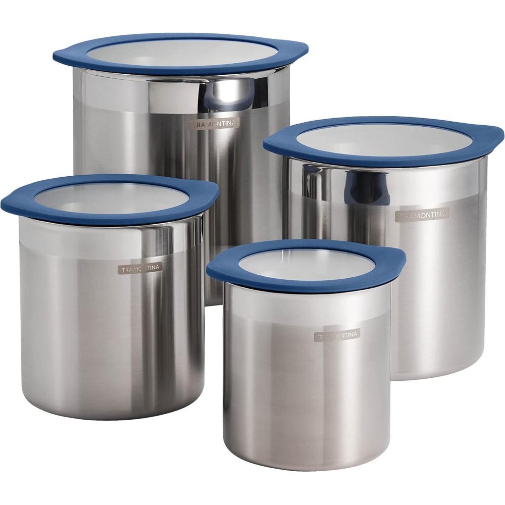 Whether you’re organizing baking ingredients or storing produce, Tramontina’s 4 Pc Stainless Steel Canister Set keeps foods fresh. Its deep drawn construction ensures a seamless surface and the durable 18/10 stainless steel material is made to last. The set’s satin interior and exterior finish with a mirror accent border adds a modern flair to your kitchen or pantry. Each canister or container comes with a shatter-resistant, air-tight tempered glass lid, which helps keep moisture out. These lids also have natural silicone rims, allowing cooks to get a better grip and seal them on tight. These pieces are a part of the Tramontina Style Collection and have a lifetime warranty. The set includes a 1.5 Qt covered canister, 2.5 Qt covered canister, 3.75 Qt covered container, and a 5.75 Qt container. Our 4 Pc Stainless Steel Canister Set is available in a variety of colors and made in Brazil .
