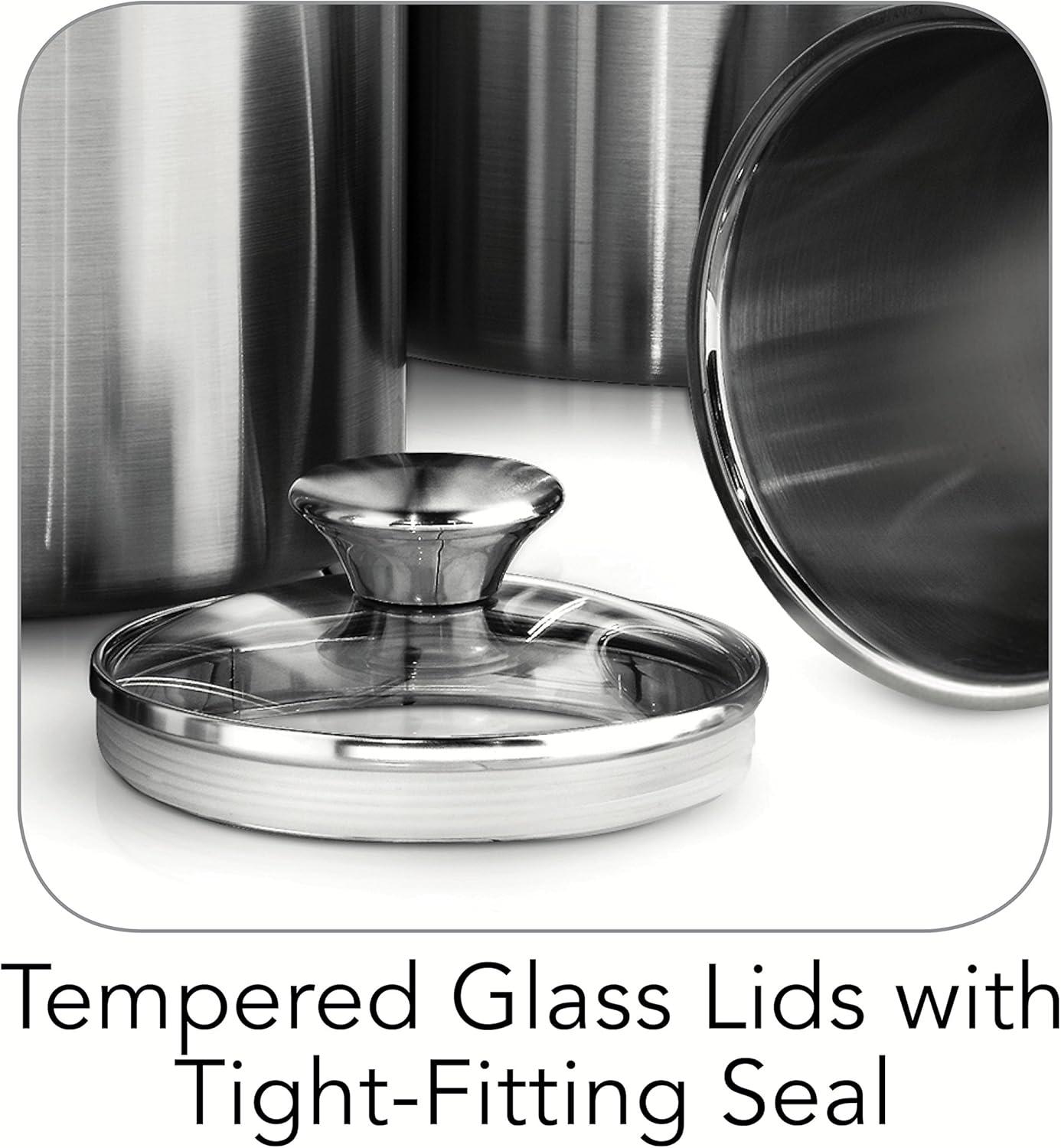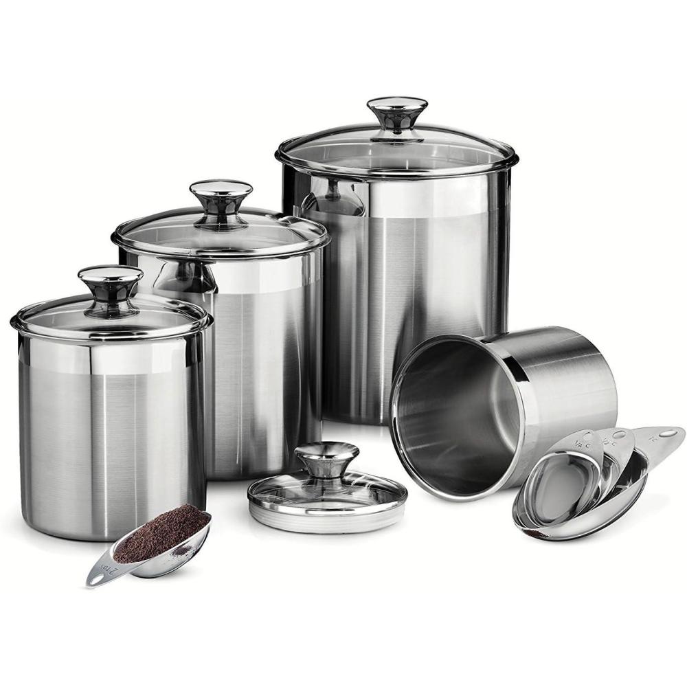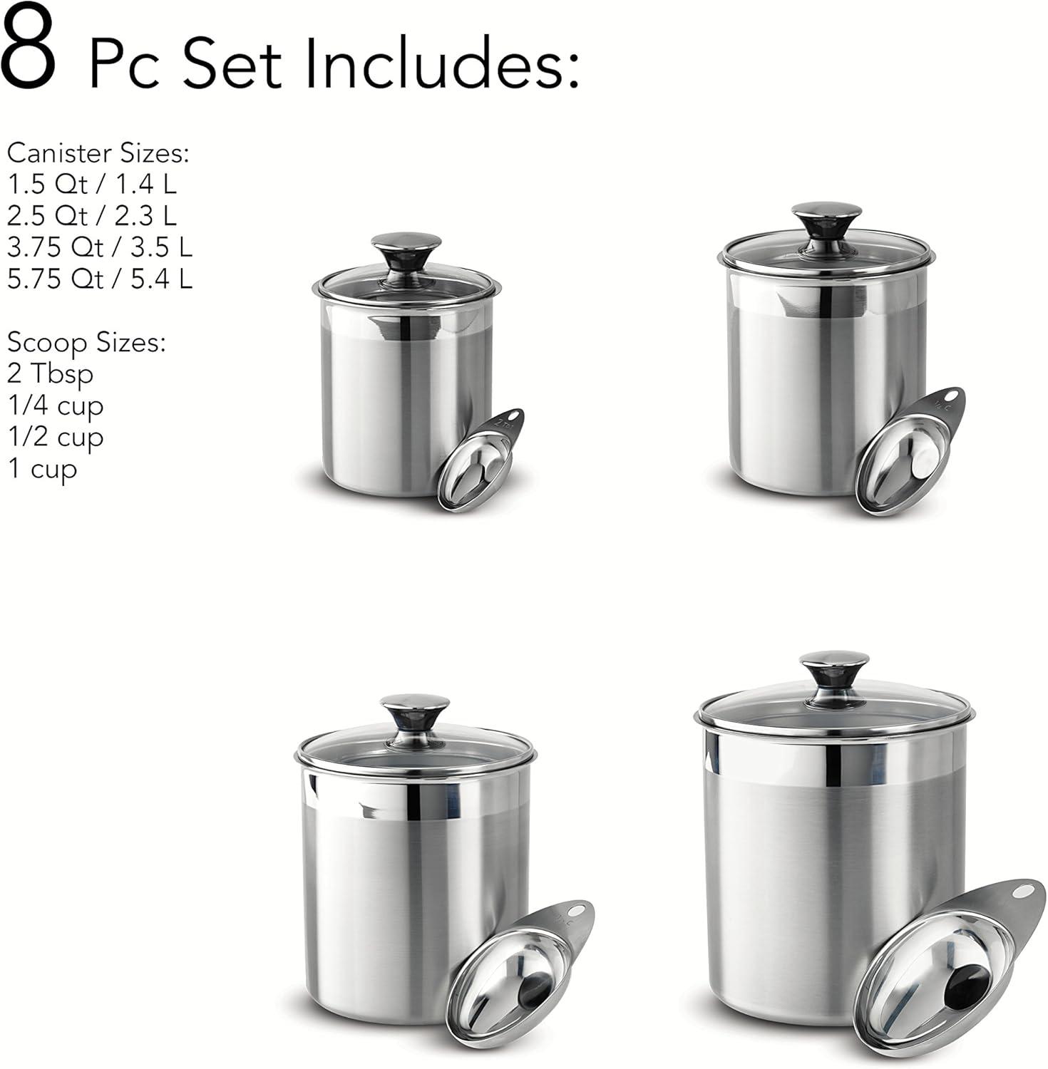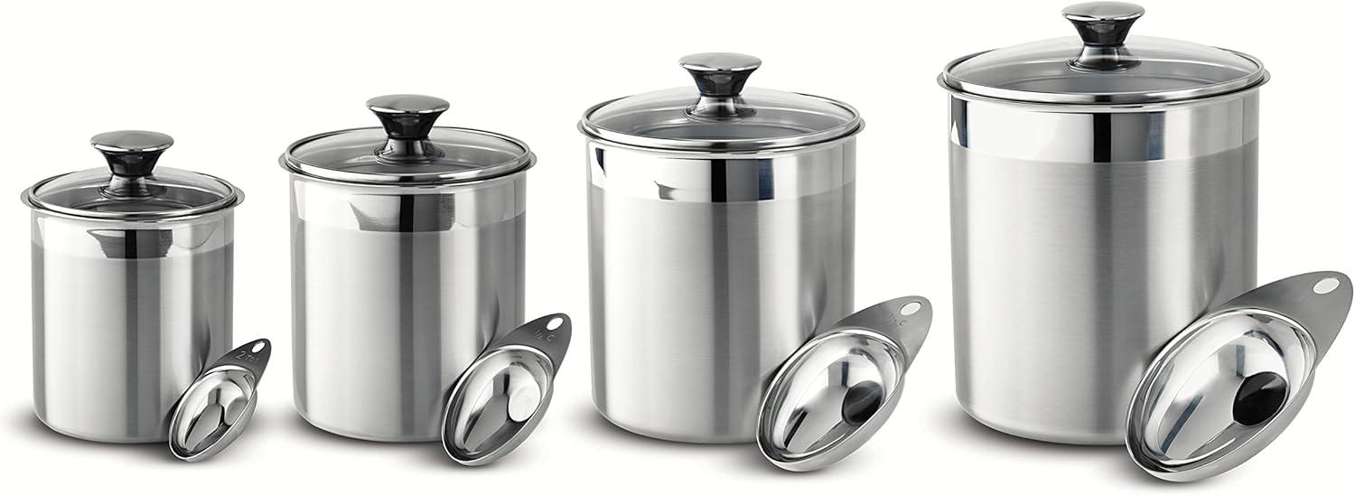 Enjoy convenient and stylish storage with this elegant glass covered Stainless Steel canister and scoops set! The exclusive Tramontina gourmet 18/10 Stainless Steel 8Piece canister and scoops set features airtight, heat and shatter resistant tempered glass lids with Stainless Steel rims and silicone gaskets for a secure seal. The glass Covers allow you to readily view the contents without lifting the lid. These canisters help keep food fresh and since they're made of durable, easy-to-clean, premium 18/10 Stainless Steel tit won't impart flavor onto your food. The canisters have a fine satin exterior finish with matching 18/10 Stainless Steel knobs plus a mirror accent border, adding a touch of decor to your pantry. The canisters come in 1-1/2, 2-1/2, 3-D/4 and 5-3/4-Quart sizes and the 18/10 Stainless Steel scoops measure 2 tbsp, 1/4 cup, 1/2 cup and 1 cup respectively. Canisters are made in Brazil, scoops are imported while the beautiful 8Piece set is assembled and packaged in the USA. And offered under lifetime .