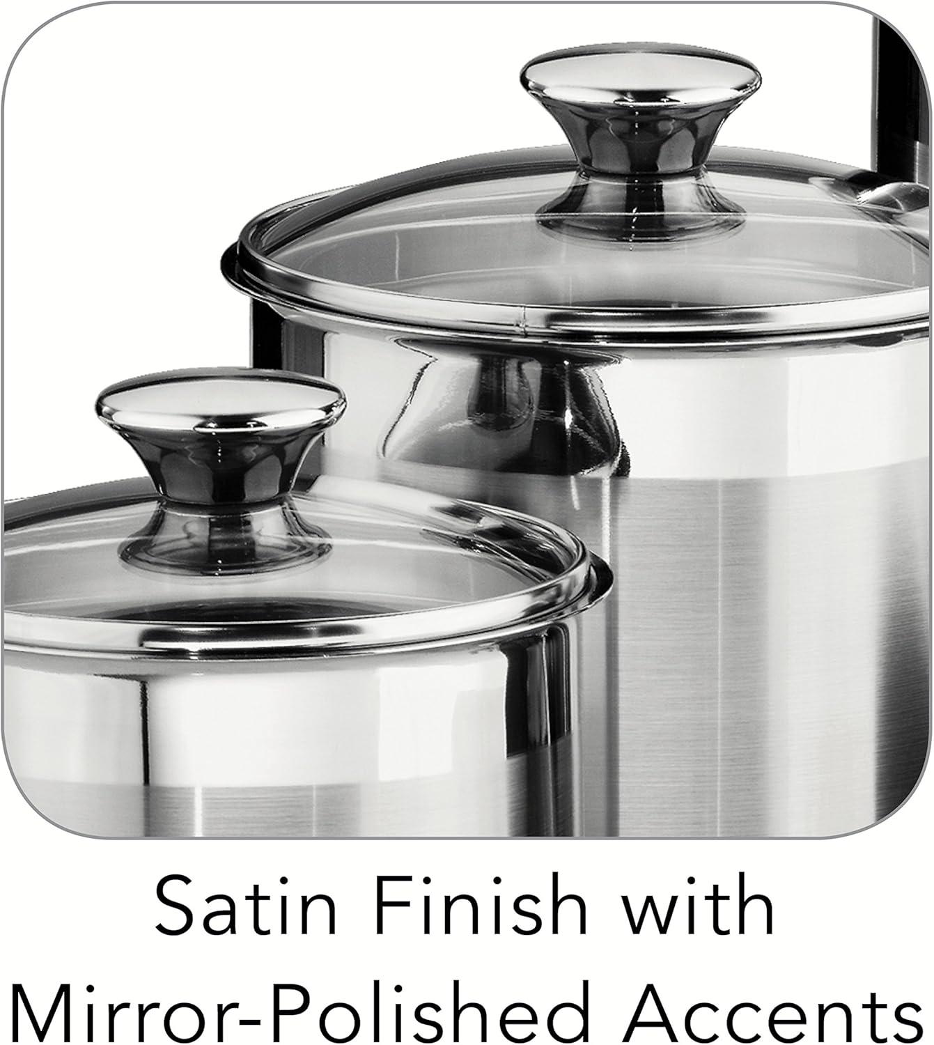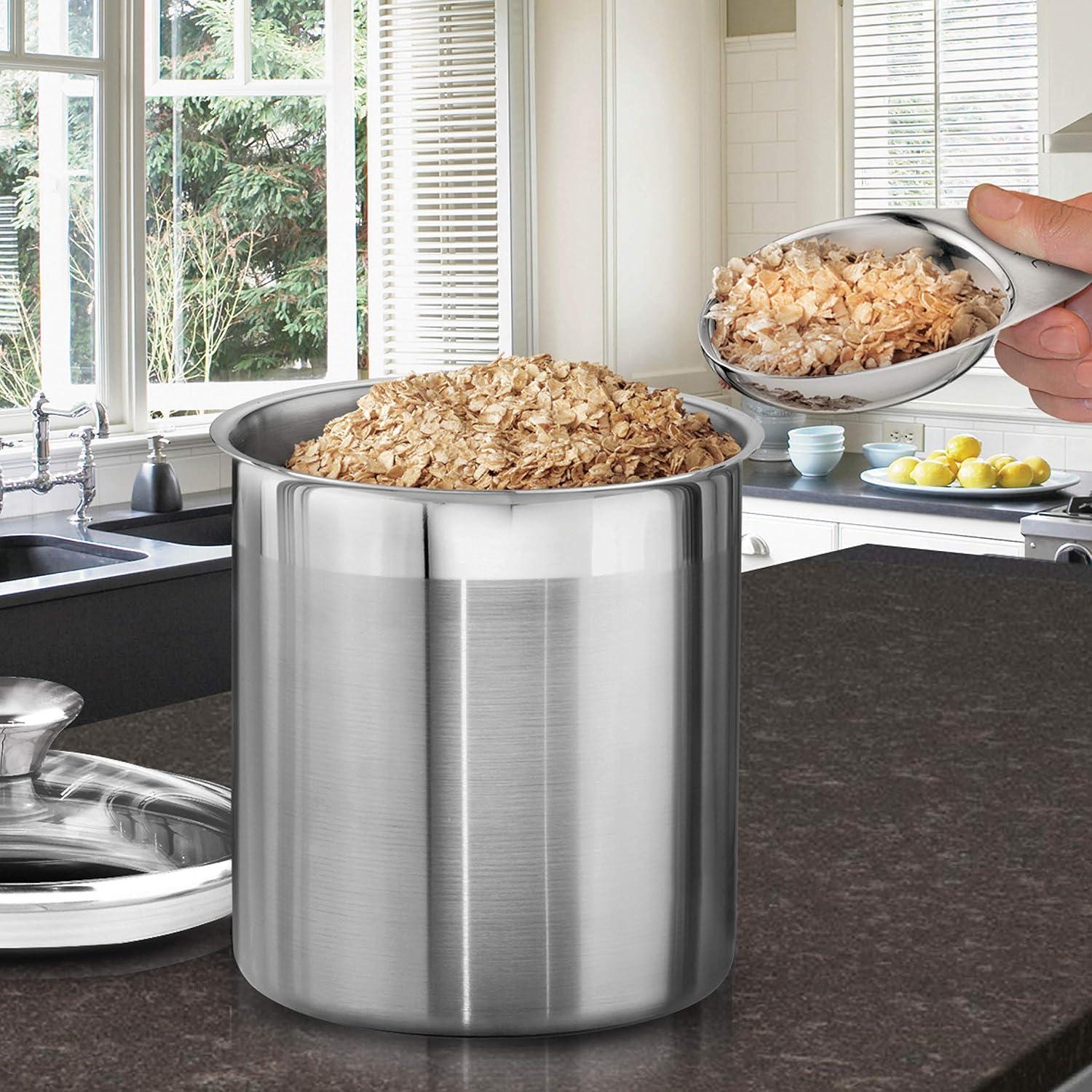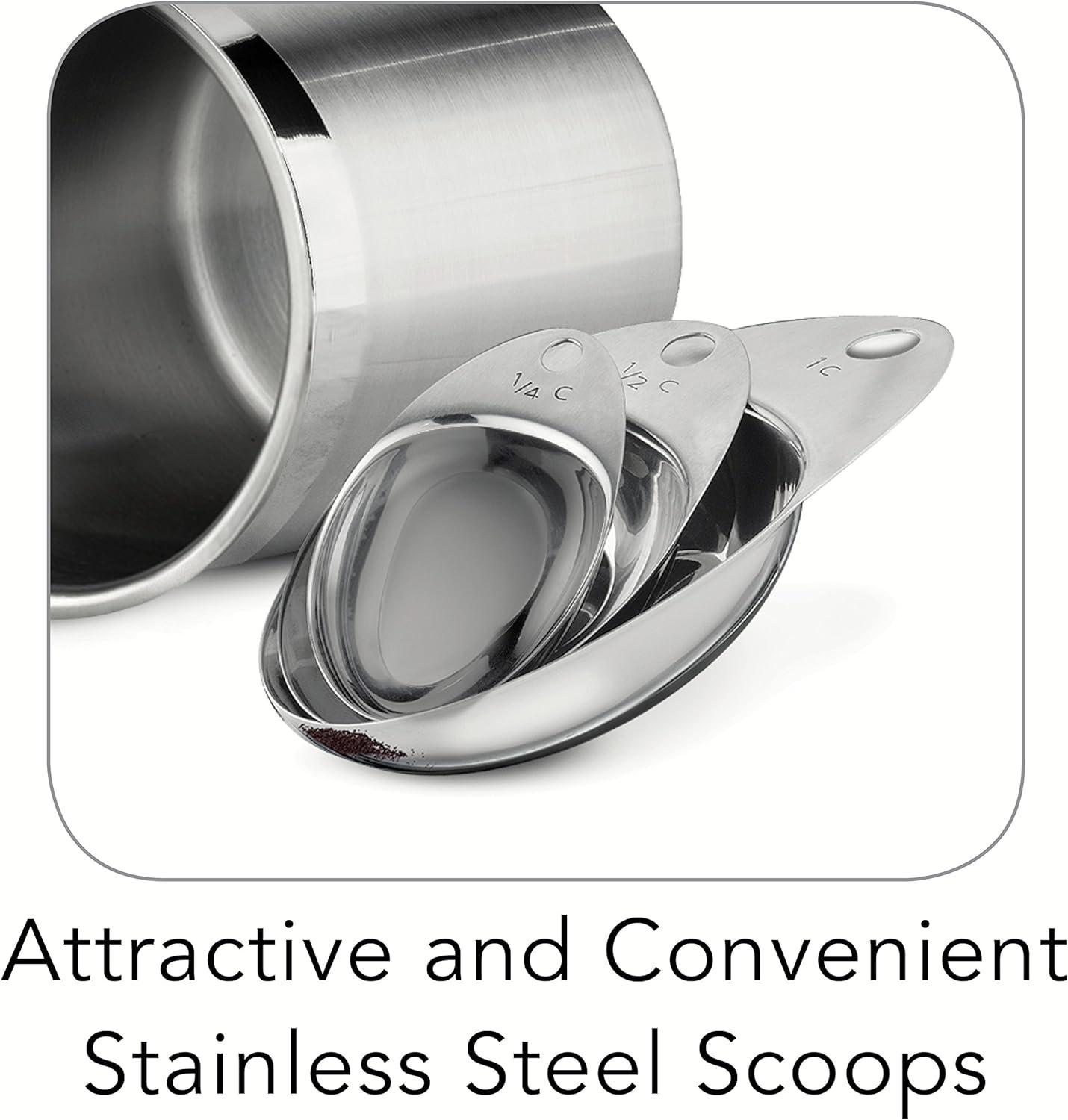 Enjoy convenient and stylish storage with this elegant glass covered Stainless Steel canister and scoops set! The exclusive Tramontina gourmet 18/10 Stainless Steel 8Piece canister and scoops set features airtight, heat and shatter resistant tempered glass lids with Stainless Steel rims and silicone gaskets for a secure seal. The glass Covers allow you to readily view the contents without lifting the lid. These canisters help keep food fresh and since they're made of durable, easy-to-clean, premium 18/10 Stainless Steel tit won't impart flavor onto your food. The canisters have a fine satin exterior finish with matching 18/10 Stainless Steel knobs plus a mirror accent border, adding a touch of decor to your pantry. The canisters come in 1-1/2, 2-1/2, 3-D/4 and 5-3/4-Quart sizes and the 18/10 Stainless Steel scoops measure 2 tbsp, 1/4 cup, 1/2 cup and 1 cup respectively. Canisters are made in Brazil, scoops are imported while the beautiful 8Piece set is assembled and packaged in the USA. And offered under lifetime .