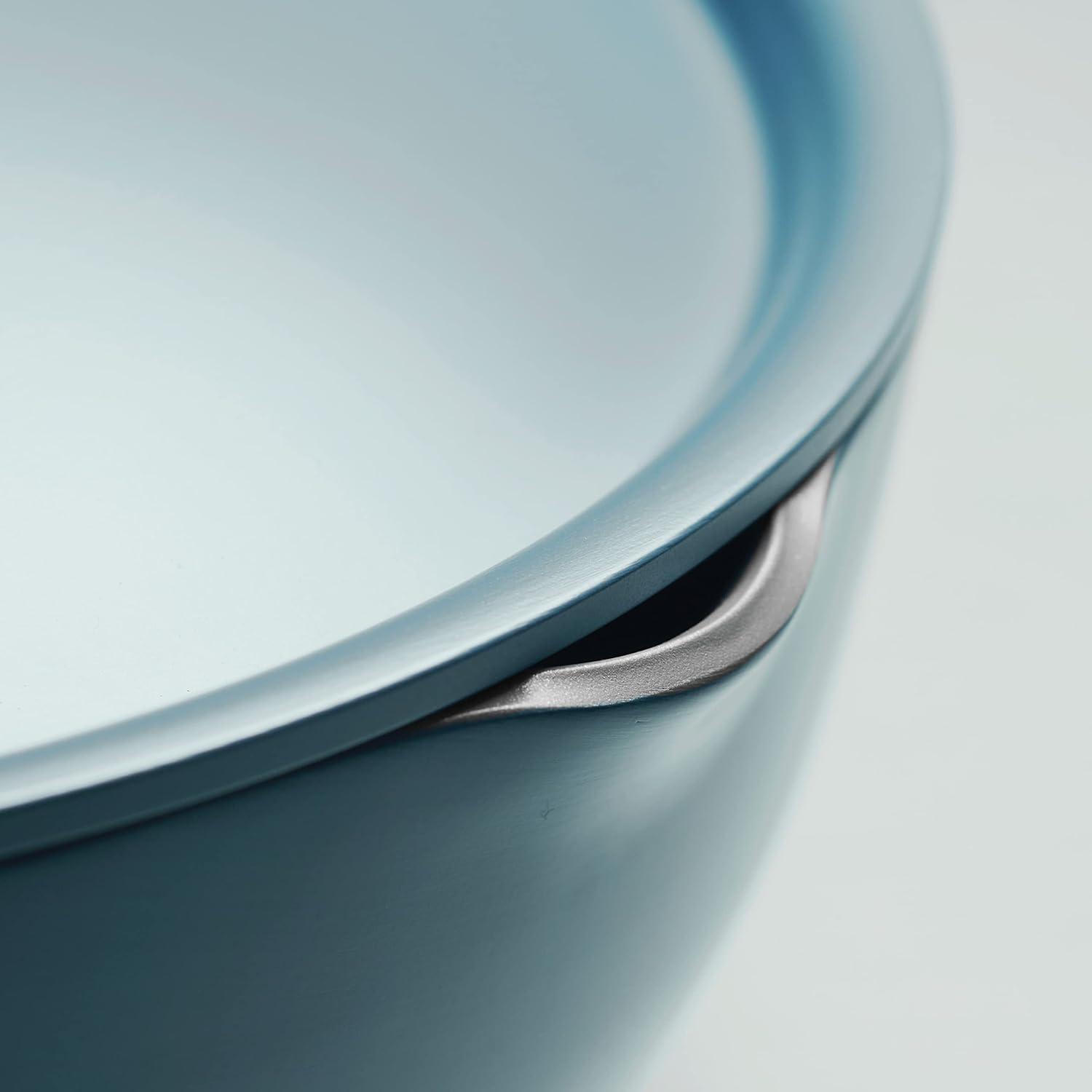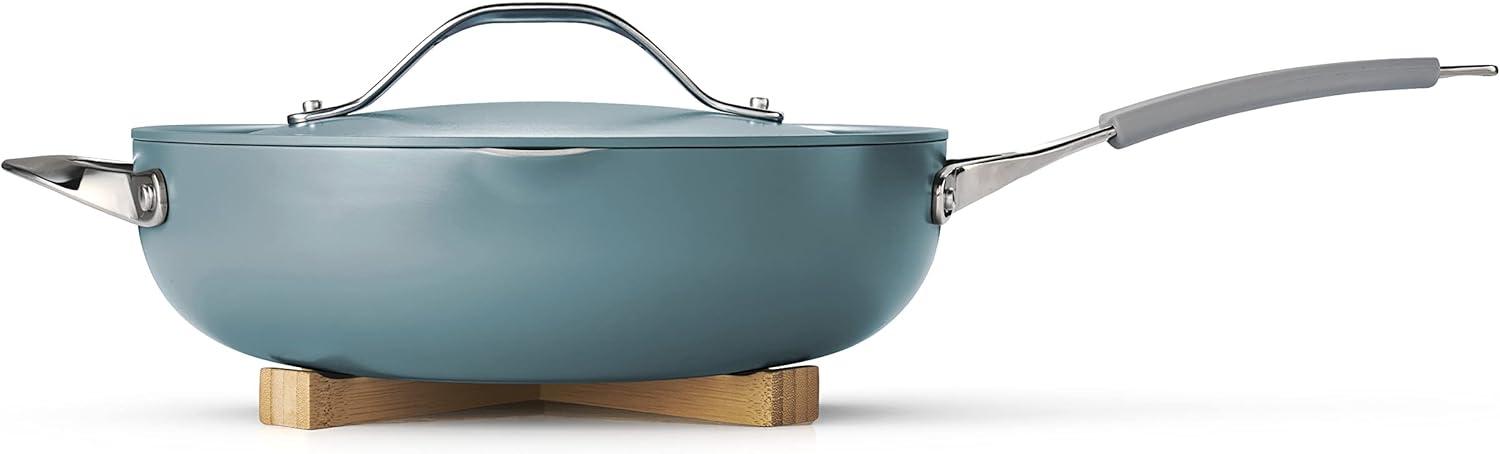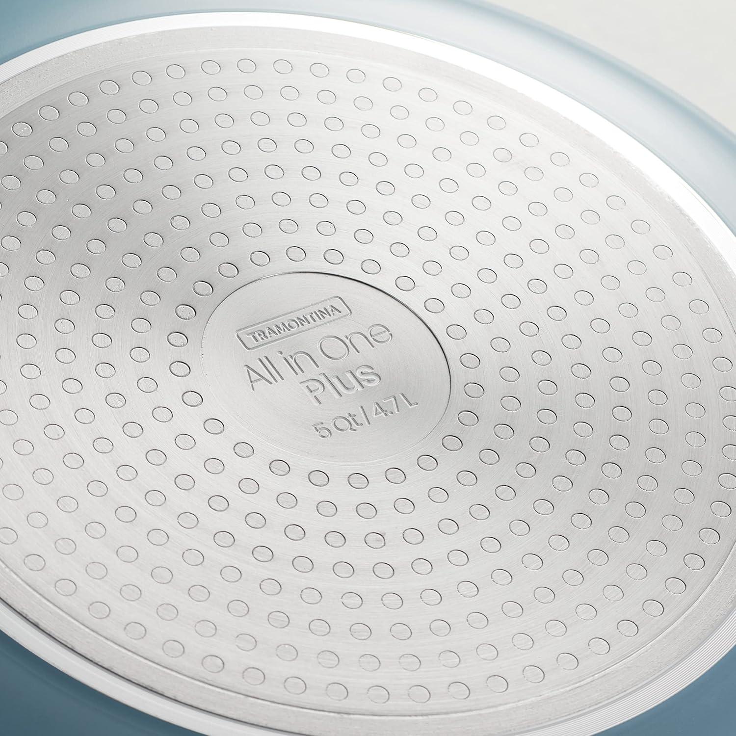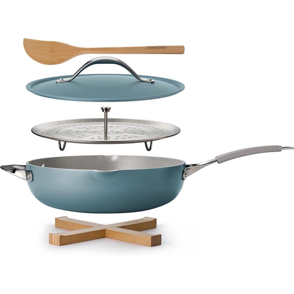 Tramontina All-in-One Plus Pan Set, 5-Quart Ceramic Non Stick Cooking Pan with Lid, Steamer Insert, Bamboo Utensil and Trivet, White(Blue)