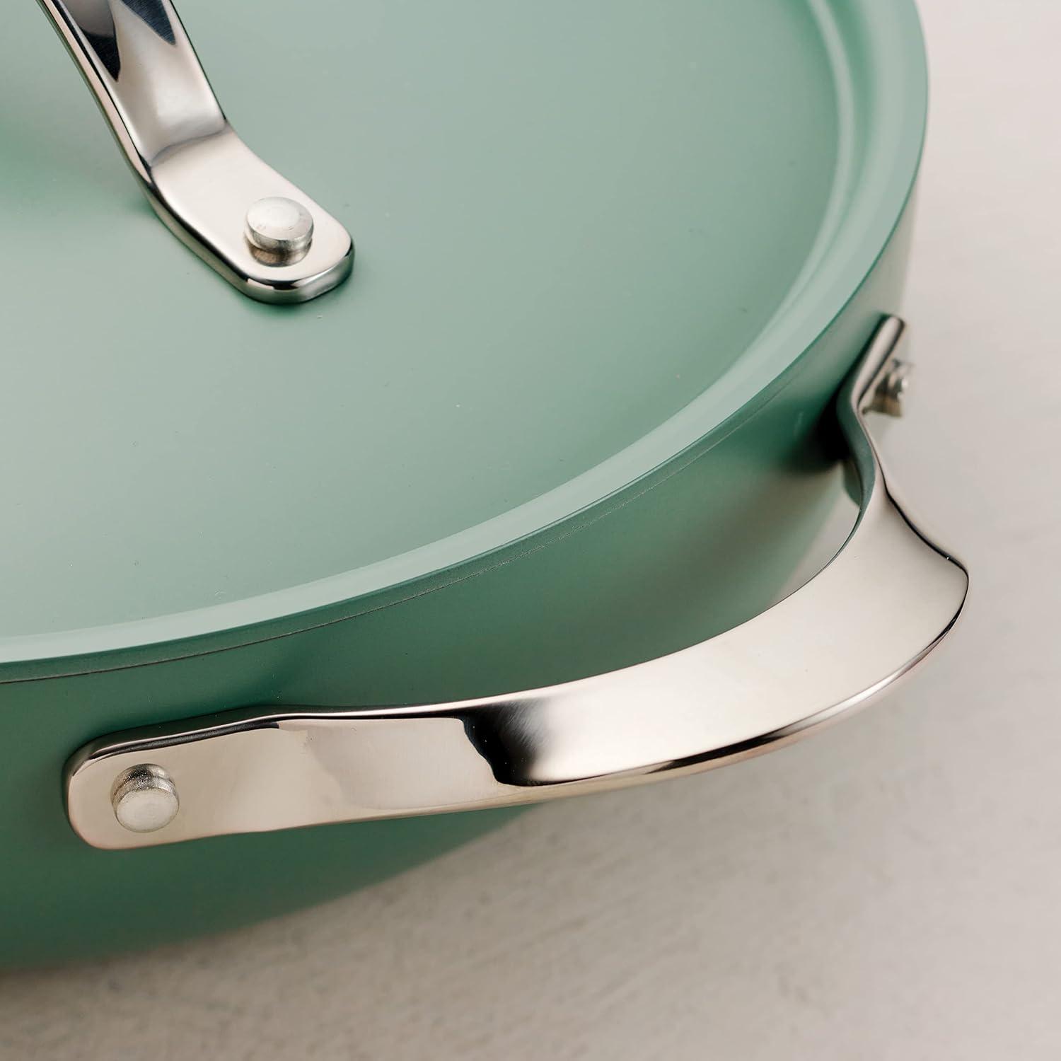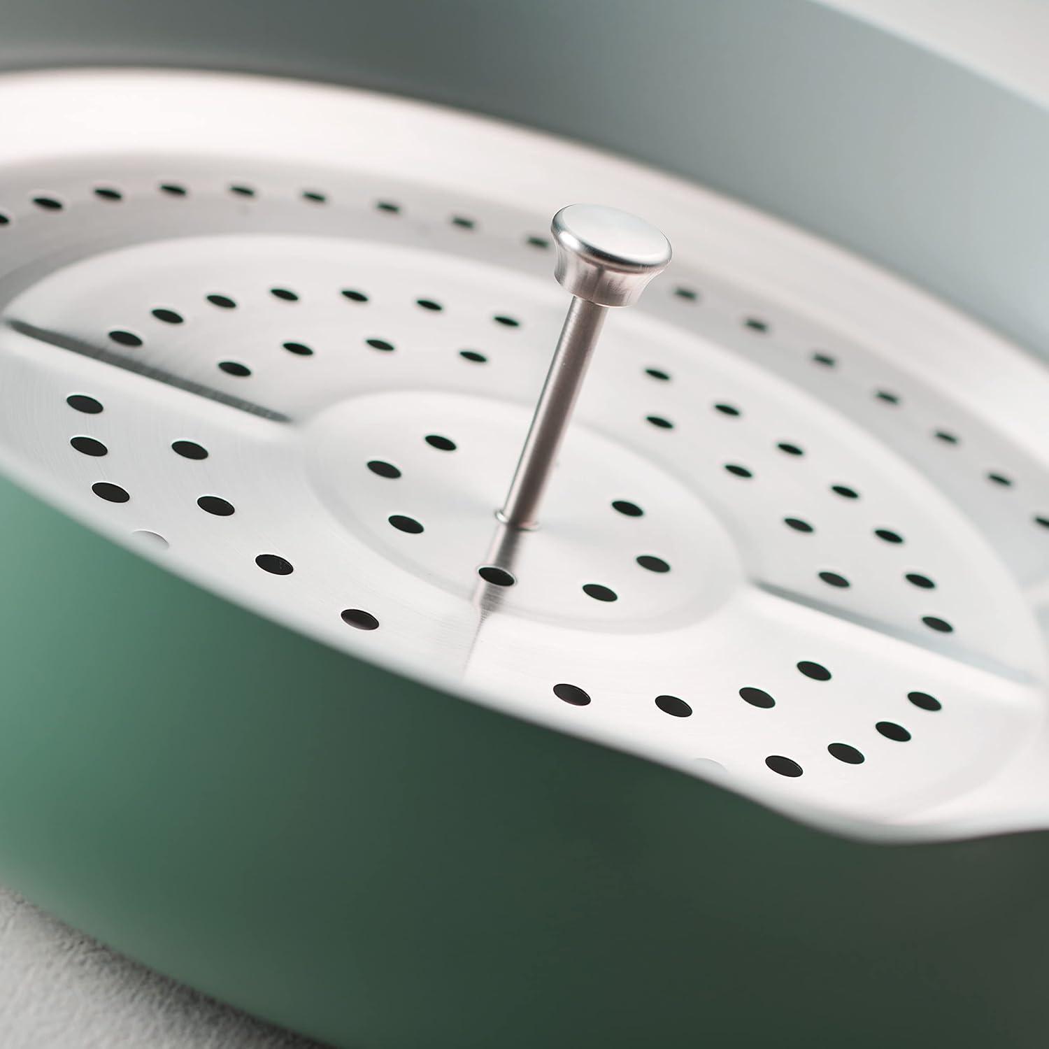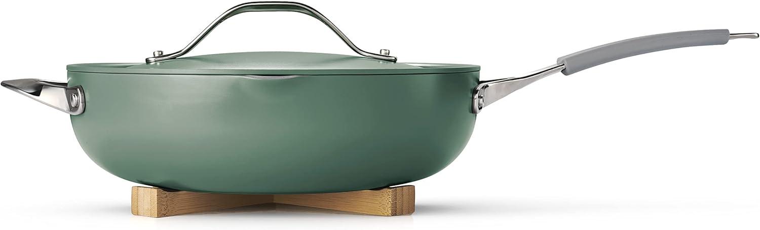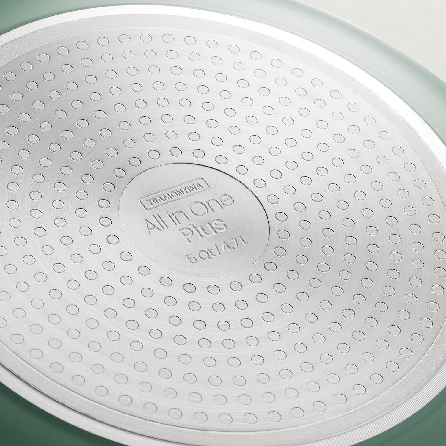 The 5 Qt Forged Aluminum Jumbo Cooker All in One Plus Pan is a versatile 5 piece set designed to do multiple things in the kitchen. It’s a great size for sauteing, frying, braising and more. The cold forged construction pan has a high temperature silicone exterior finish and SWISS Crystals® ceramic non-stick interior that easily wipes clean. The induction-ready stainless steel base plate with magnetic core allows you to use the all in one plus pan on any cooktop. Each set includes a unique aluminum lid with a stainless steel handle that doubles as a spoon rest, a multi-purpose bamboo utensil for flipping and stirring, a convenient nesting steamer insert, and a bamboo trivet that’s perfect for taking the pan directly from kitchen to table. It’s oven-safe up to 450° F/232° C and dishwasher-safe. The Tramontina 5 Qt Forged Aluminum Jumbo Cooker All In One Plus Pan is made in China and comes in seven stylish colors.