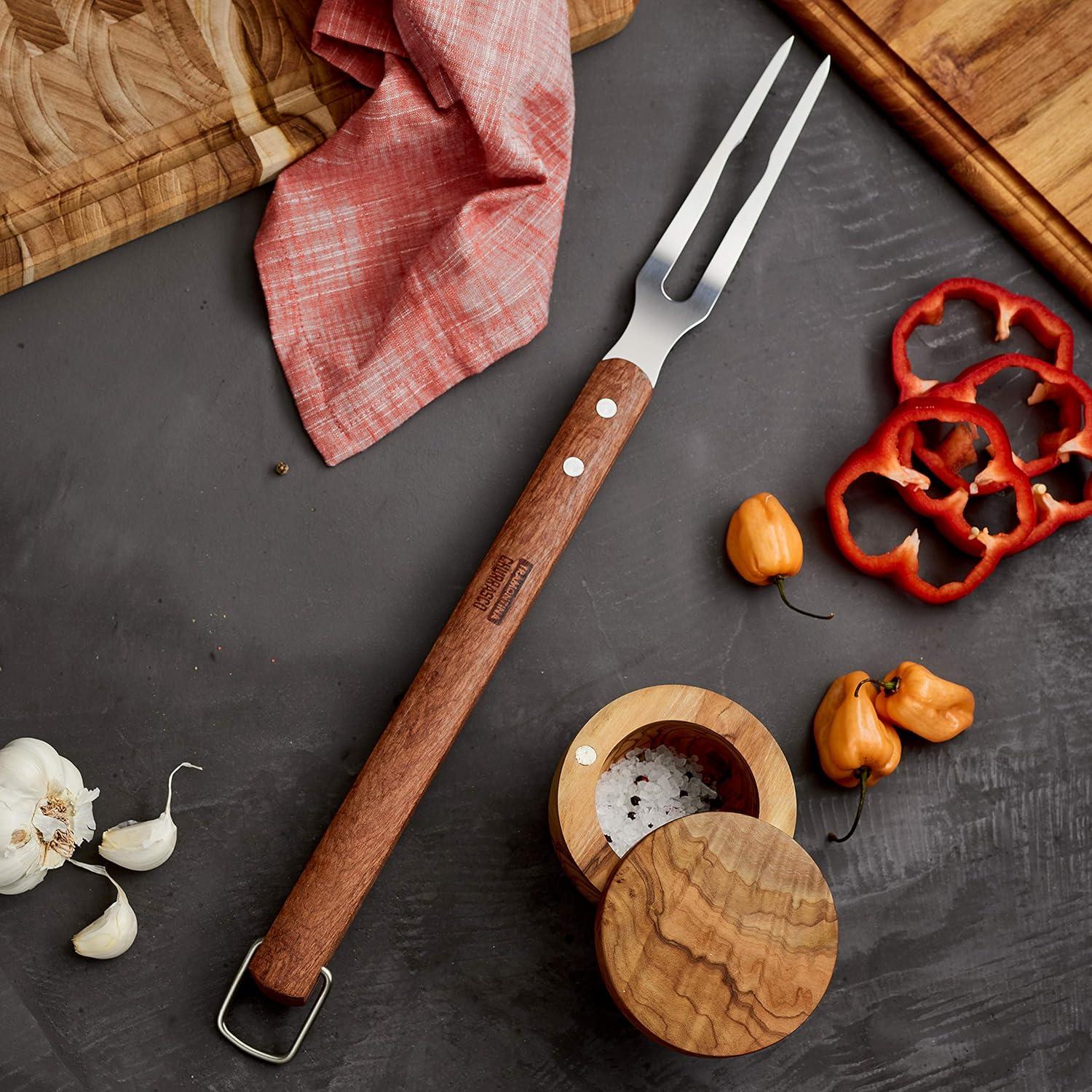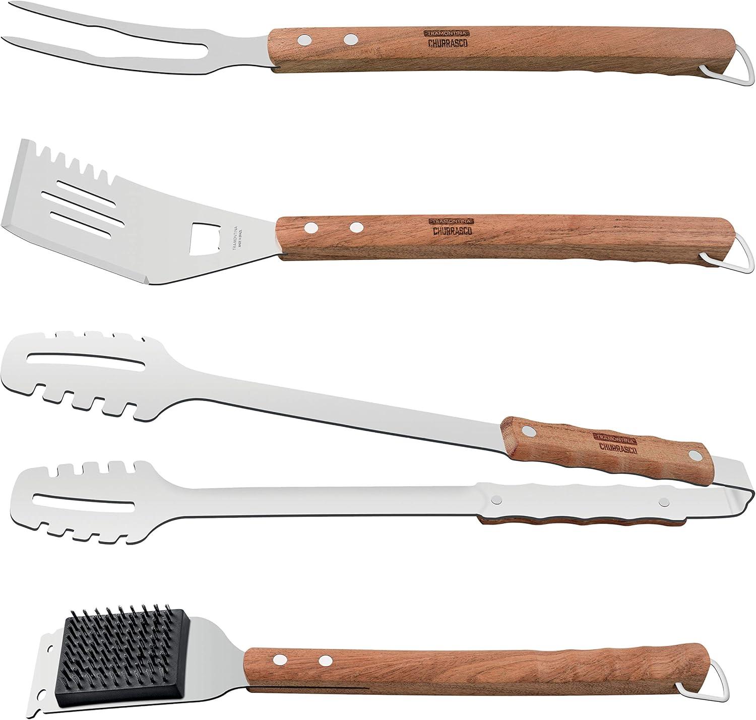Bundle includes: stainless Steel Multipurpose Spatula with 18.8 in Wood Handle, stainless Steel Barbecue Tongs with 18.6 in Wood Handle, stainless Steel Grill Brush with 17.4 in Wood Handle and stainless Steel Carving Fork with 18.5 in Wood Handle