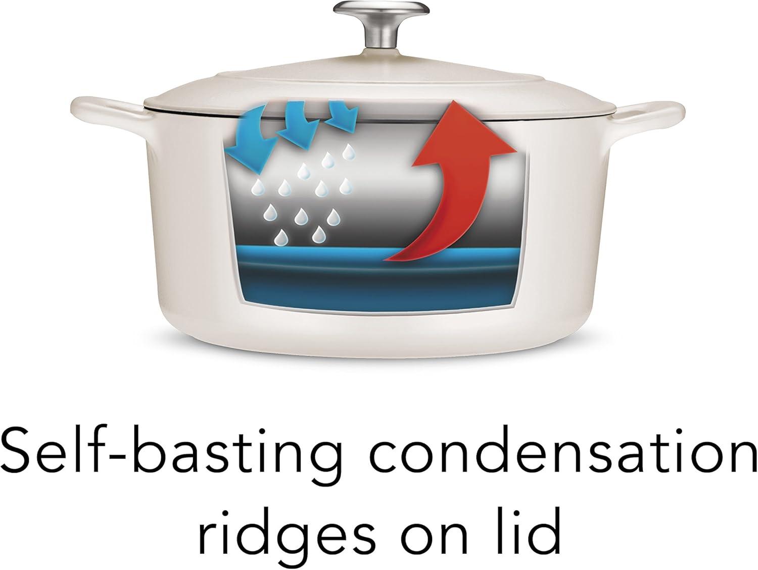 Moisture-Locking Lid: Equipped with self-basting condensation ridges on the cast iron lid to uniformly collect and direct vapors back onto food, creating moist and flavorful dishes.