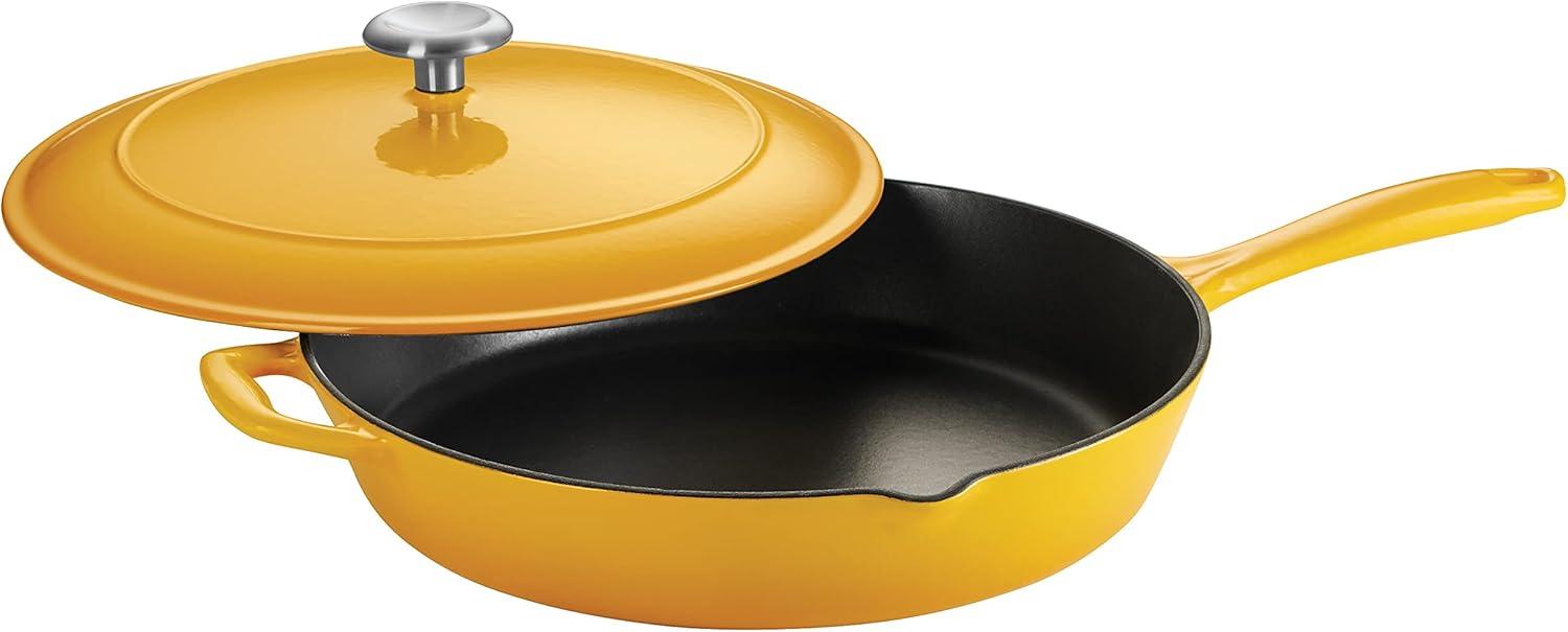 The enameled cast-iron skillet is part of Tramontina's Gourmet collection of premium products engineered and manufactured with the finest design, materials and workmanship, outperforming similar products within the market and delivering the best quality and value to the cooking professional and enthusiast alike. Prized by cooks for superior heat distribution and retention this enameled cast-iron skillet provides outstanding cooking results and comes in a vibrant, gradated porcelain enamel exterior finish while offering an elegant kitchen to table serving option. The self-basting condensation ridges under the tight-fit lid return vapor back onto foods for moist, flavorful recipes. Equipped with a convenient helper handle and two pouring lips, this pan will soon become a staple in your kitchen for recipes that include frying, searing, browning or poaching. The covered skillet has a matte black porcelain enamel cooking surface that is easy-to-clean. Hand-wash only, compatible with all cooktops and oven-safe to 450 F. This product is assembled and packaged in USA and offered under a lifetime warranty.