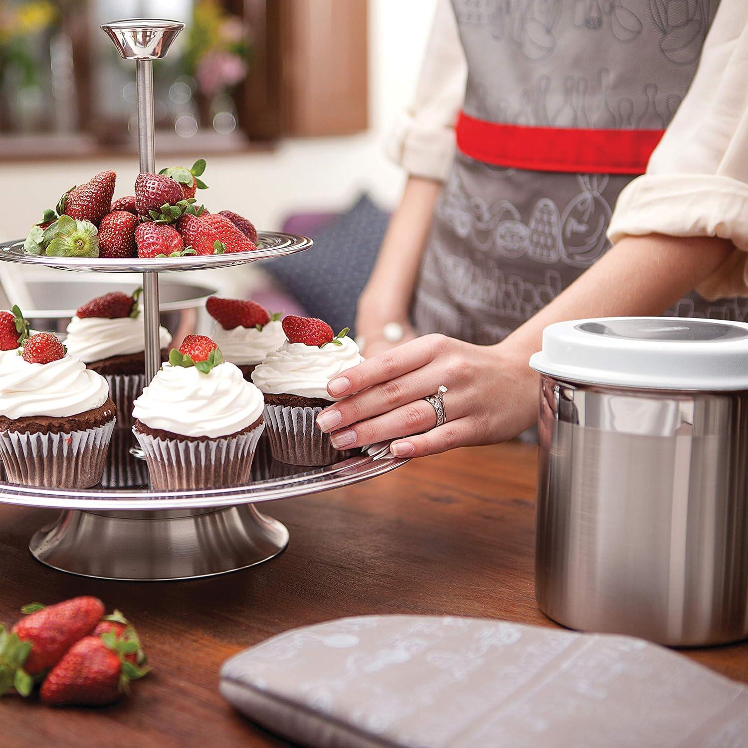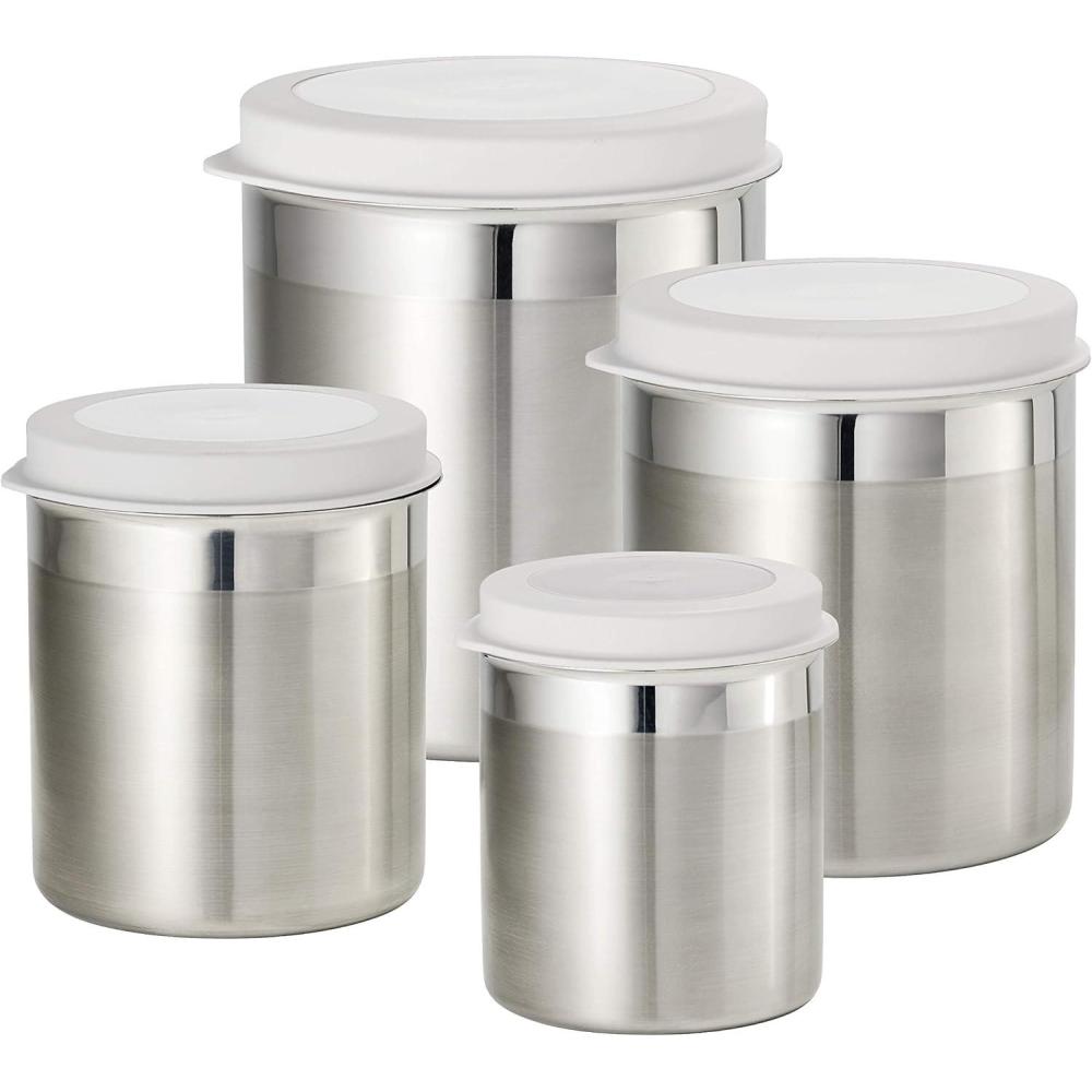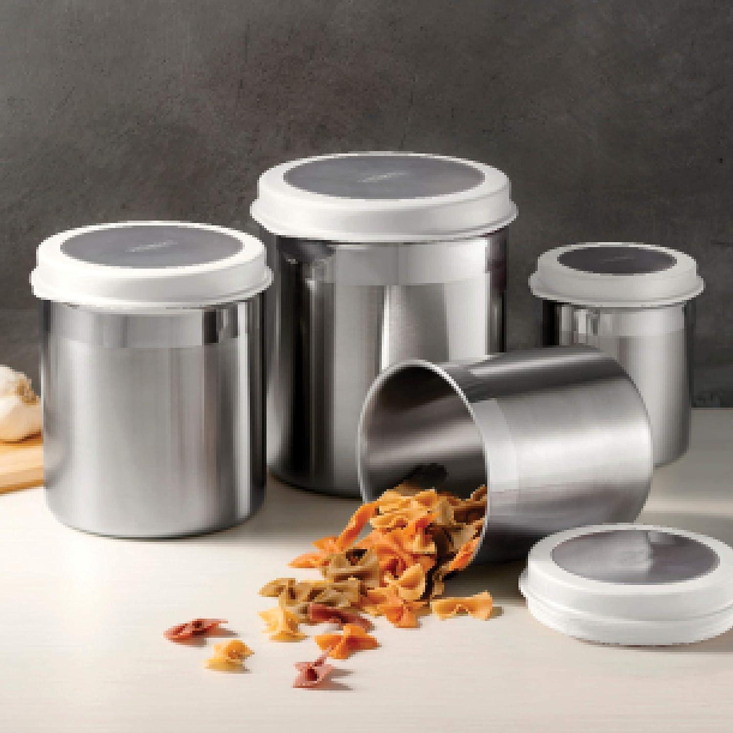 Got pasta, rice, grains, or cereals to store? Get rid of boxes and hard-to-seal packages for good with the Tramontina's 4 Pc Stainless Steel Canister Set, complete with see-through plastic lids. Made to preserve your non-perishables, the set includes containers in four different sizes, each with its own tight-fitting plastic lid. Each lid also features a window allowing you to see what’s inside at a glance. The set also comes with stickers for labeling your containers’ contents. Made of durable 18/10 stainless steel, the set will last long, and its low-maintenance matte finish will look great on any countertop! Made in Brazil. Available in a variety of colors.