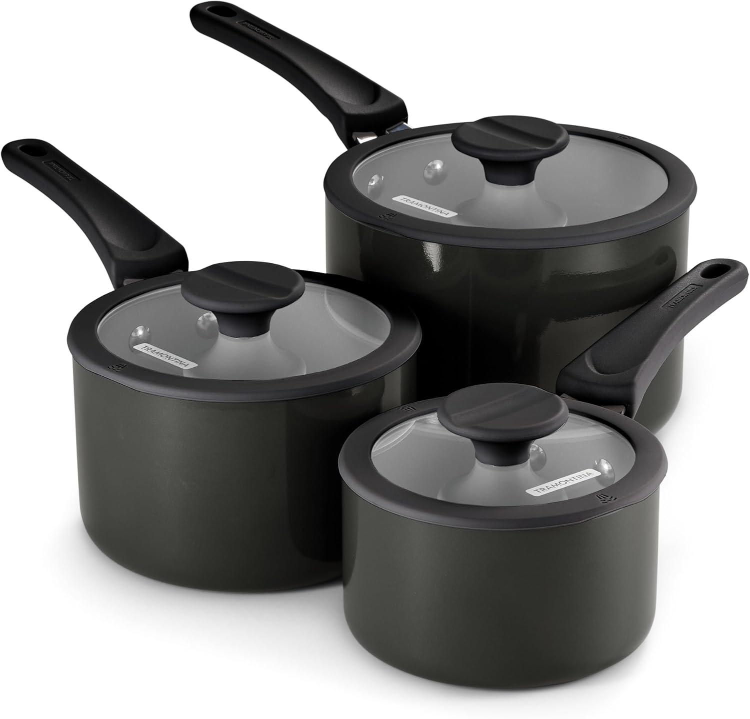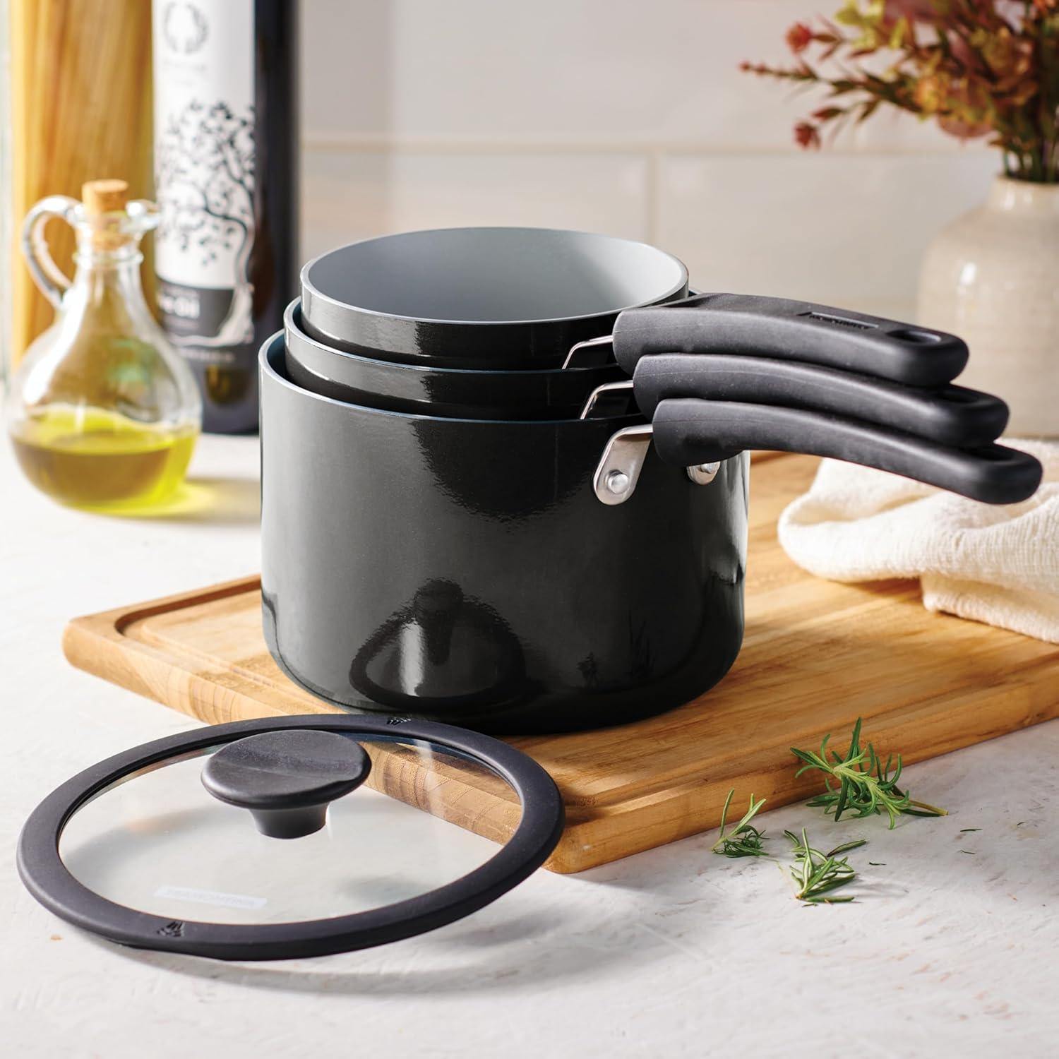 6-Piece Set Includes: 1.25-quart, 2-quart, and 3-quart covered saucepans for versatile cooking