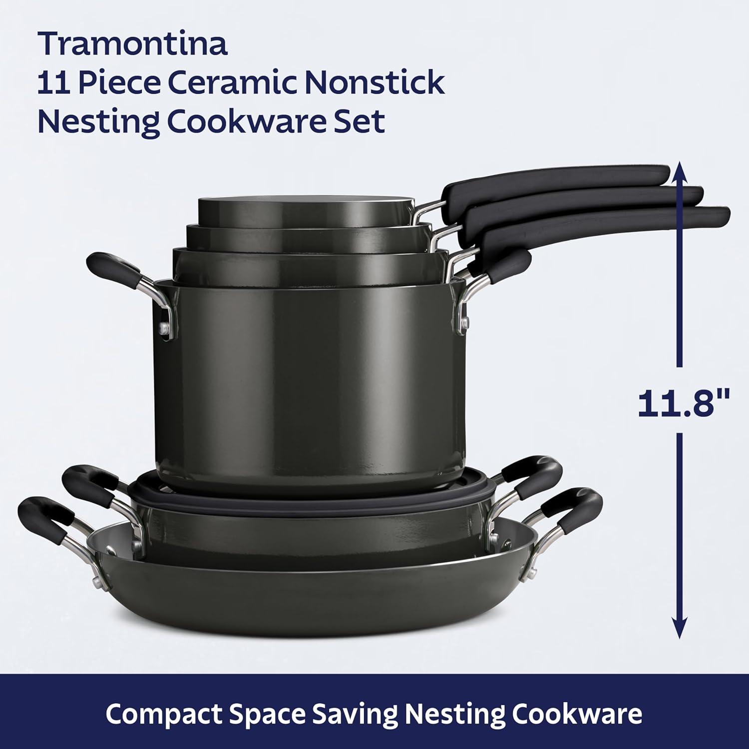 Simplify your cooking and maximize your storage space with the Tramontina 6-Piece Ceramic Nonstick Nesting Cookware Set. This space-saving cookware set stacks neatly together to free up cabinet space without compromising on performance. Set Contents: This 6-piece set includes: a 1.25-quart, a 2-quart, and a 3-quart covered saucepan. Crafted from heavy-gauge aluminum, each piece distributes heat evenly for consistent results. The smooth interior is coated with premium, Swiss-made ILAG ceramic nonstick, which ensures easy food release, quick cleanup, and supports healthier cooking. The soft-grip silicone handles stay cool while you cook, and the shatter-resistant glass lids let you monitor every simmer and sauté.6 Available in Sea Spray, Mediterranean (Teal), Dark Gray, and Blanc de Blanc (White). Oven-safe up to 350°F (176°C) and backed by Tramontina’s Lifetime Warranty.