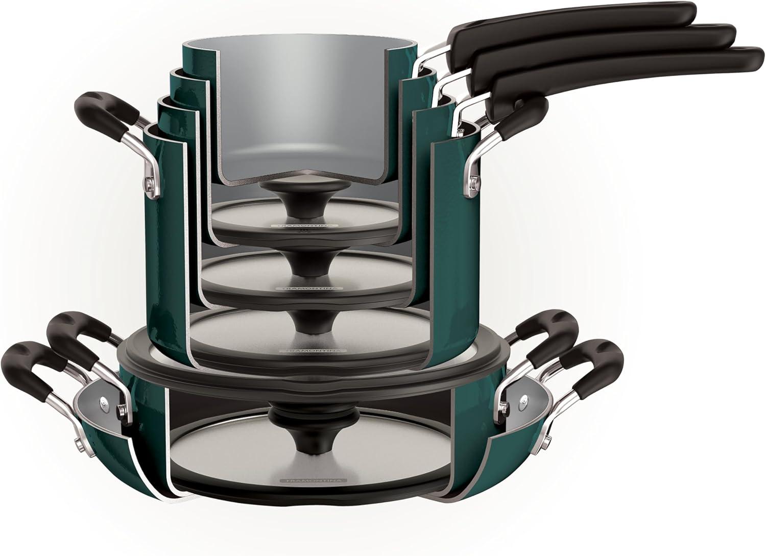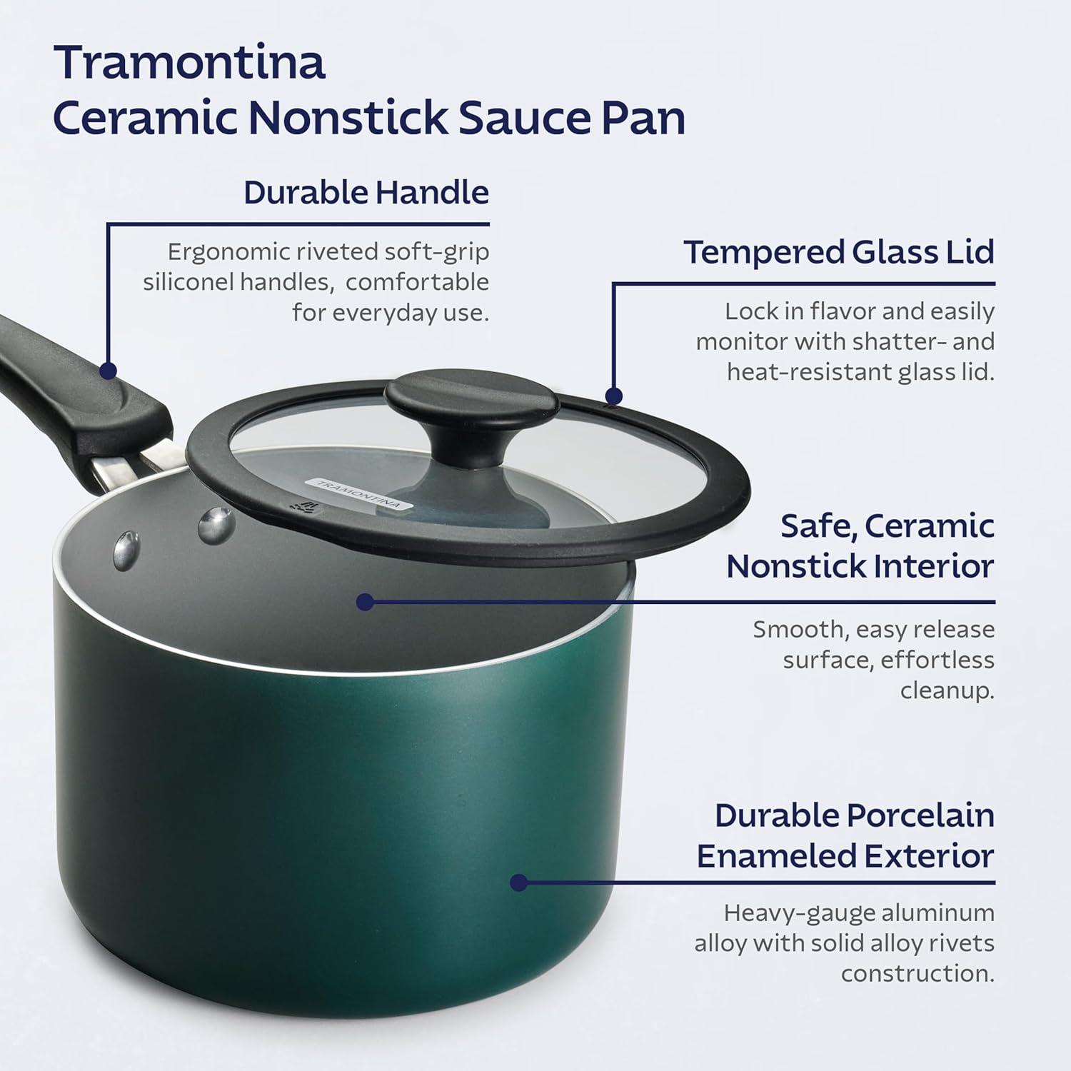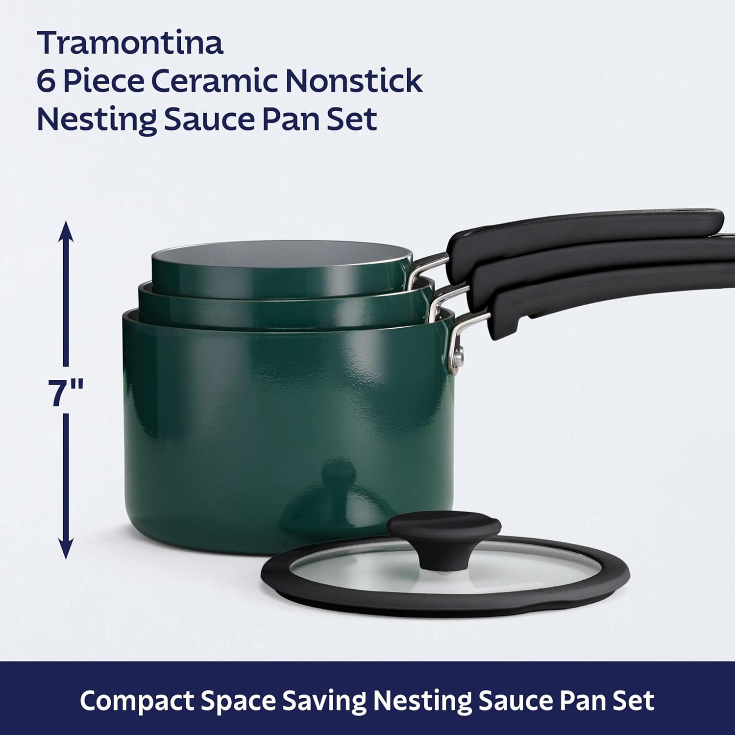 Simplify your cooking and maximize your storage space with the Tramontina 6-Piece Ceramic Nonstick Nesting Cookware Set. This space-saving cookware set stacks neatly together to free up cabinet space without compromising on performance. Set Contents: This 6-piece set includes: a 1.25-quart, a 2-quart, and a 3-quart covered saucepan. Crafted from heavy-gauge aluminum, each piece distributes heat evenly for consistent results. The smooth interior is coated with premium, Swiss-made ILAG ceramic nonstick, which ensures easy food release, quick cleanup, and supports healthier cooking. The soft-grip silicone handles stay cool while you cook, and the shatter-resistant glass lids let you monitor every simmer and sauté.6 Available in Sea Spray, Mediterranean (Teal), Dark Gray, and Blanc de Blanc (White). Oven-safe up to 350°F (176°C) and backed by Tramontina’s Lifetime Warranty.