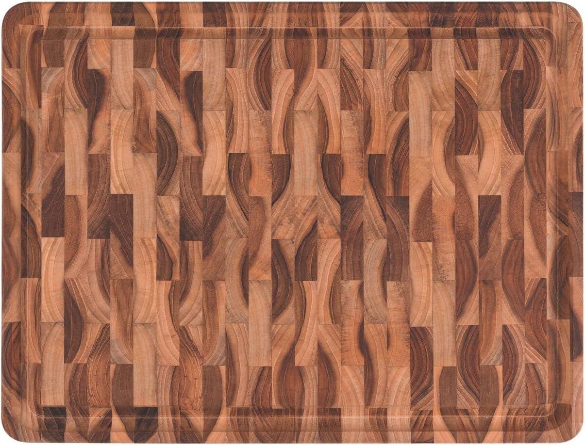 You'll notice Tramontina's 17.75 in x 13.5 in Teak Wood End-Grain Chopping Board thanks to their distinctive pattern. You'll love the chopping board – favored by cooking enthusiasts, because it requires little to no maintenance. End-grain chopping boards are made from the short pieces of lumber – in our case, durable, authentic Brazilian teak wood – that are grafted together vertically with the end pieces making up the surface. The look is as eye-catching as it is functional. The board's dense surface also makes it more stable during use – while its carved out groove along the edge catches juice or liquid so it won't spill over the side.