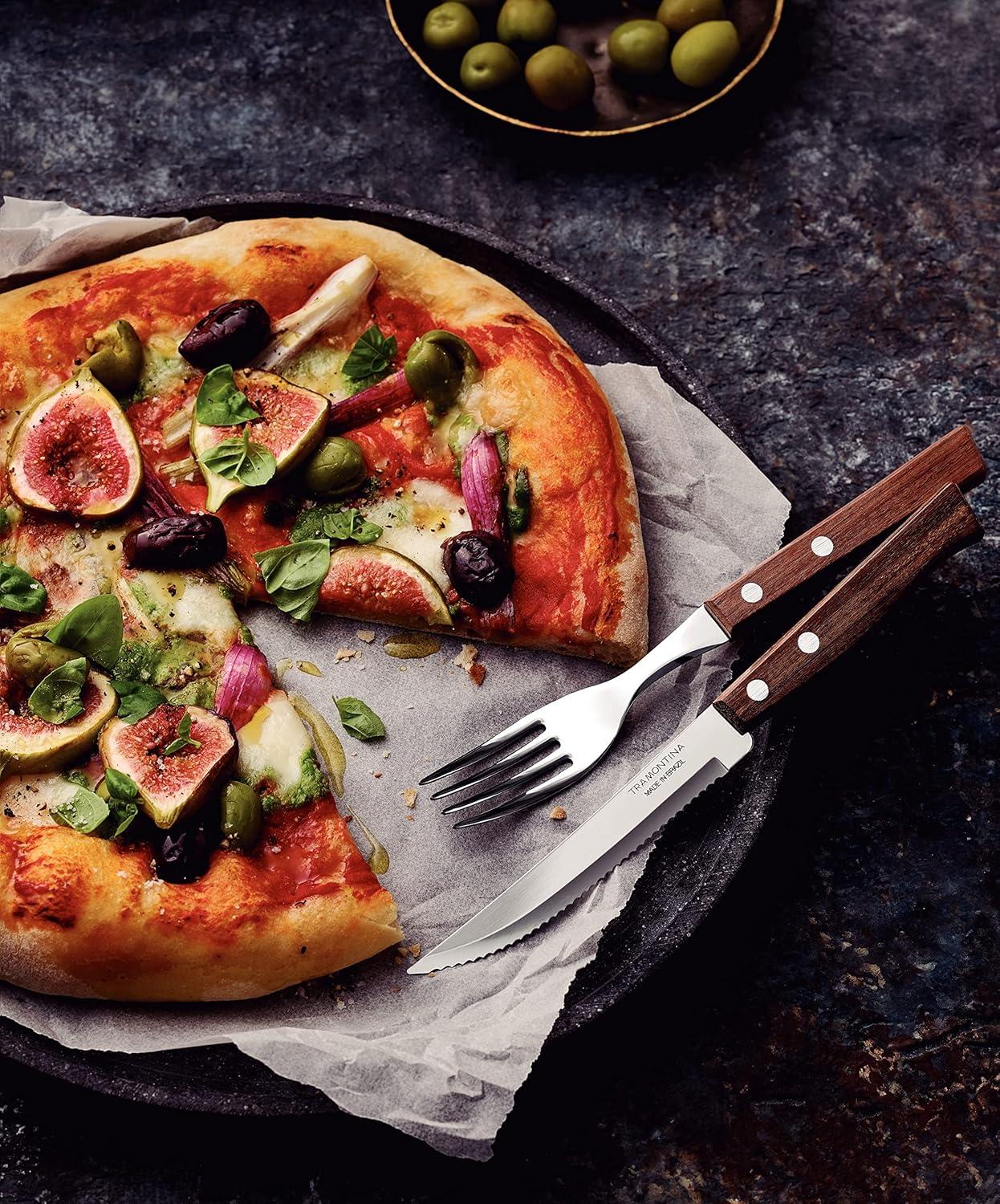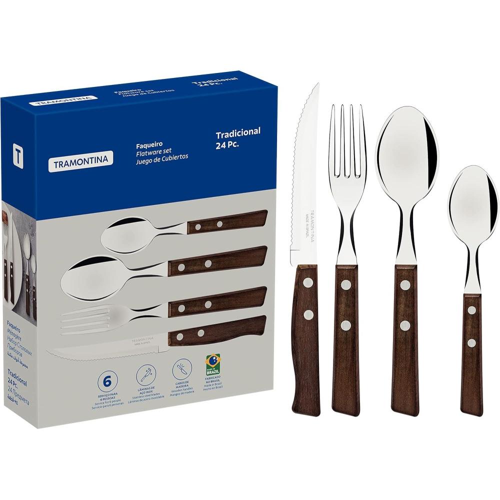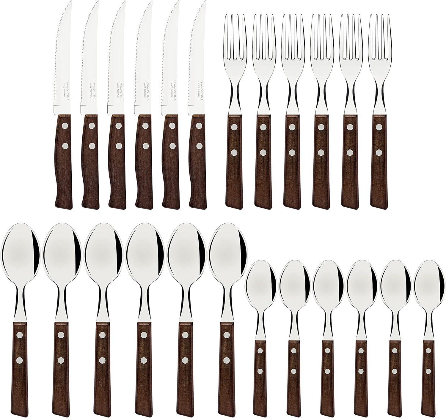 Tramontina Cutlery Set with Steak Knives, 24 Piece Sharp Knife, Forks, Teaspoons, Tablespoons with Wooden Handles, ‎Camping, Kitchen, Rustic, 22299050
