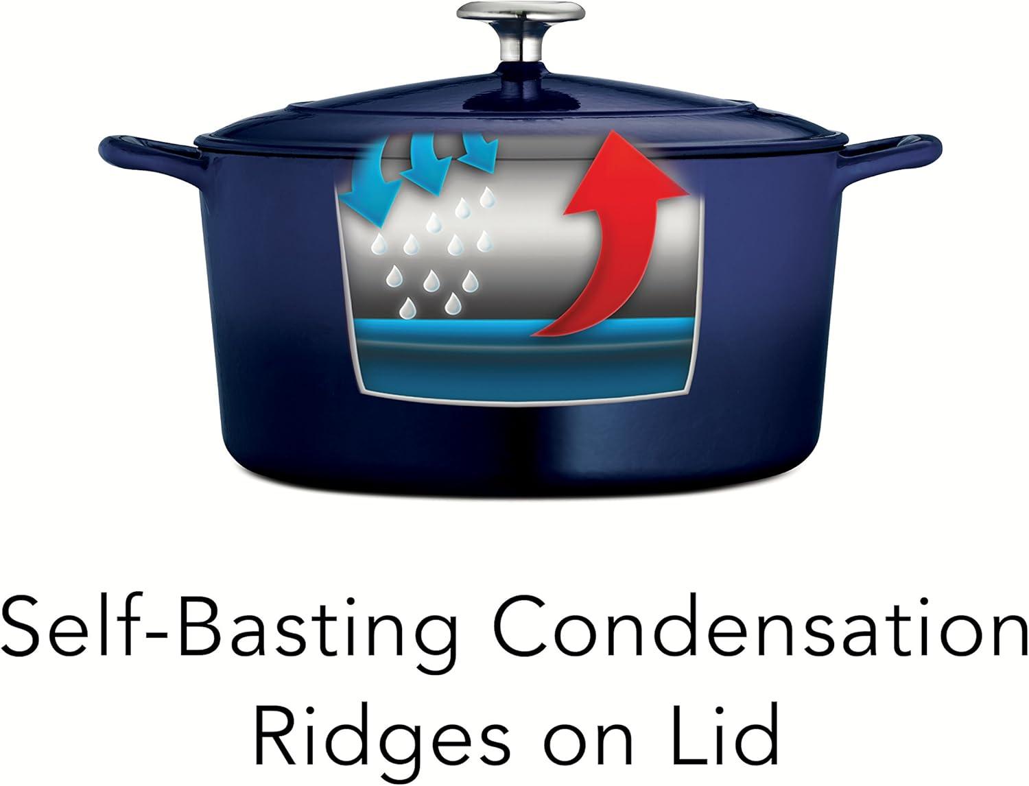 The enameled cast-iron 6. 5 qt Covered round Dutch oven is part of Tramontina gourmet collection of premium products Engineered and manufactured with the finest design, materials and workmanship, outperforming similar products within the market and delivering the best quality and value to the cooking professional and enthusiast alike. Prized by cooks for heat retention and even cooking, This enameled cast-iron 6. 5 qt Covered round Dutch oven will deliver heat slowly to tenderize meats, poultry and vegetables and comes in a vibrant, gradated porcelain enamel exterior finish offering an elegant kitchen to table serving option. The self-basting condensation ridges on lid uniformly collect and direct vapors onto food, so your Vegetarian lasagna and pork tenderloins serve up incredibly moist and flavorful. The round Dutch oven also cooks fruit cobblers, cornbread and a buffet's worth of baked favorites. Sturdy side handles make for secure lifting and transferring of the Tramontina enameled cast-iron Dutch oven to your table. The heavy-gauge cast-iron covered round Dutch oven cooking surface is coated with off-white, smooth and easy-to-clean PFOA- and PTFE-free porcelain enamel. Hand-wash only, compatible with all cooktops and oven-safe to 450 F. This product is assembled and packaged in USA and offered under a lifetime .