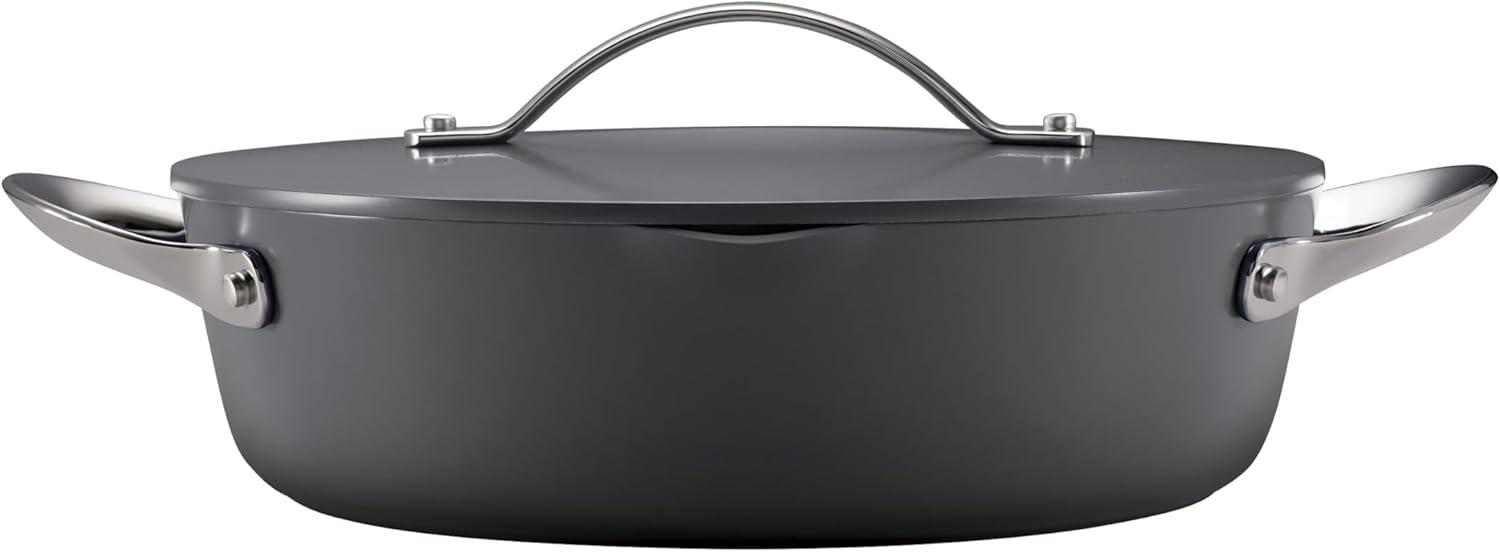 Discover the perfect blend of functionality and elegance. Designed for home cooks who value reliability and convenience, this pan is your go-to tool for creating delicious meals with ease. Imagine a pan that not only meets but exceeds your cooking needs. Whether you're sautéing vegetables, searing meats, stir-frying noodles, braising stews, simmering sauces, or slow-roasting your favorite dishes, the Fiora pan handles it all effortlessly. Its heavy-gauge aluminum construction ensures even heat distribution, eliminating hot spots and ensuring perfectly cooked meals every time. The ILAG® Swiss Crystal ceramic non-stick interior makes cleanup a breeze. No more scrubbing or soaking—just a quick rinse, and it's ready for your next culinary adventure. The aluminum alloy lid, featuring self-basting condensation ridges, locks in moisture and flavor, enhancing the taste and tenderness of your dishes. Heavy-duty riveted handles provide a comfortable and secure grip, making it easy to transfer from stovetop to oven, where it’s safe up to 400°F (205°C). Compatible with all cooktops, including induction, gas, electric, and ceramic glass, this pan is as versatile as it is durable.