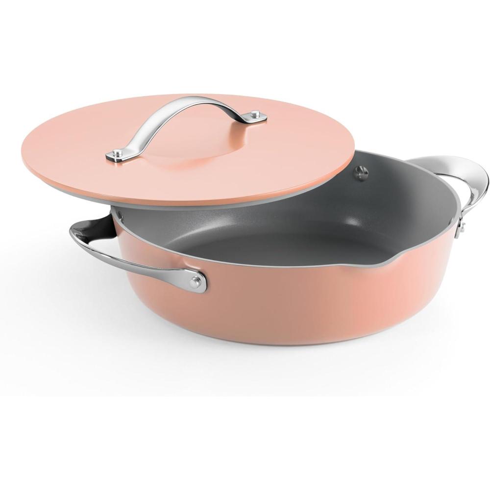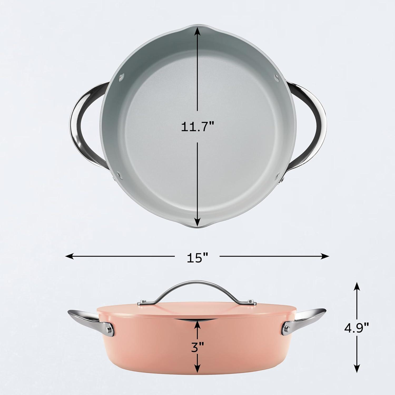 Discover the perfect blend of functionality and elegance. Designed for home cooks who value reliability and convenience, this pan is your go-to tool for creating delicious meals with ease. Imagine a pan that not only meets but exceeds your cooking needs. Whether you're sautéing vegetables, searing meats, stir-frying noodles, braising stews, simmering sauces, or slow-roasting your favorite dishes, the Fiora pan handles it all effortlessly. Its heavy-gauge aluminum construction ensures even heat distribution, eliminating hot spots and ensuring perfectly cooked meals every time. The ILAG® Swiss Crystal ceramic non-stick interior makes cleanup a breeze. No more scrubbing or soaking—just a quick rinse, and it's ready for your next culinary adventure. The aluminum alloy lid, featuring self-basting condensation ridges, locks in moisture and flavor, enhancing the taste and tenderness of your dishes. Heavy-duty riveted handles provide a comfortable and secure grip, making it easy to transfer from stovetop to oven, where it’s safe up to 400°F (205°C). Compatible with all cooktops, including induction, gas, electric, and ceramic glass, this pan is as versatile as it is durable.