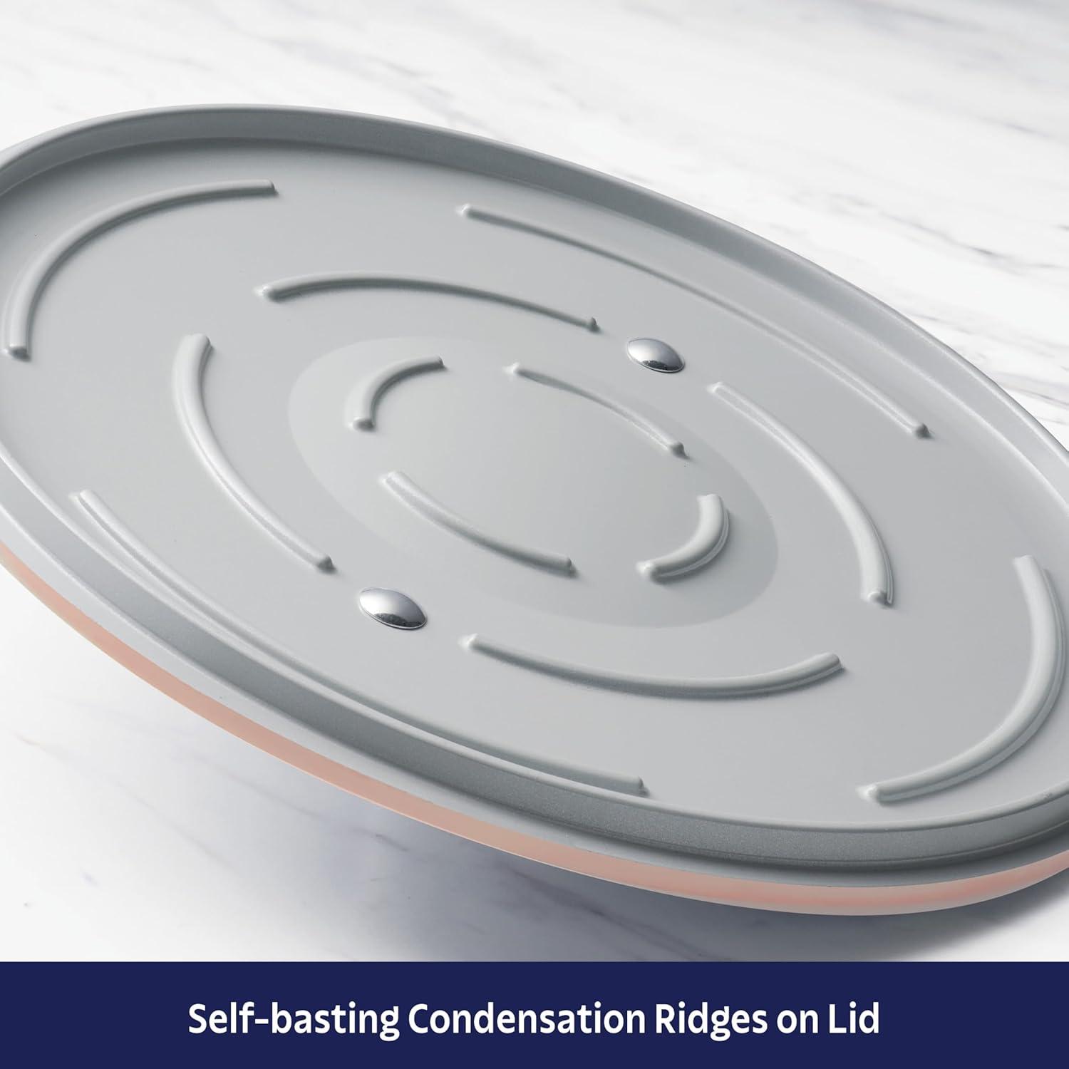 Self-basting Lid: Aluminum alloy lid with self-basting condensation ridges.