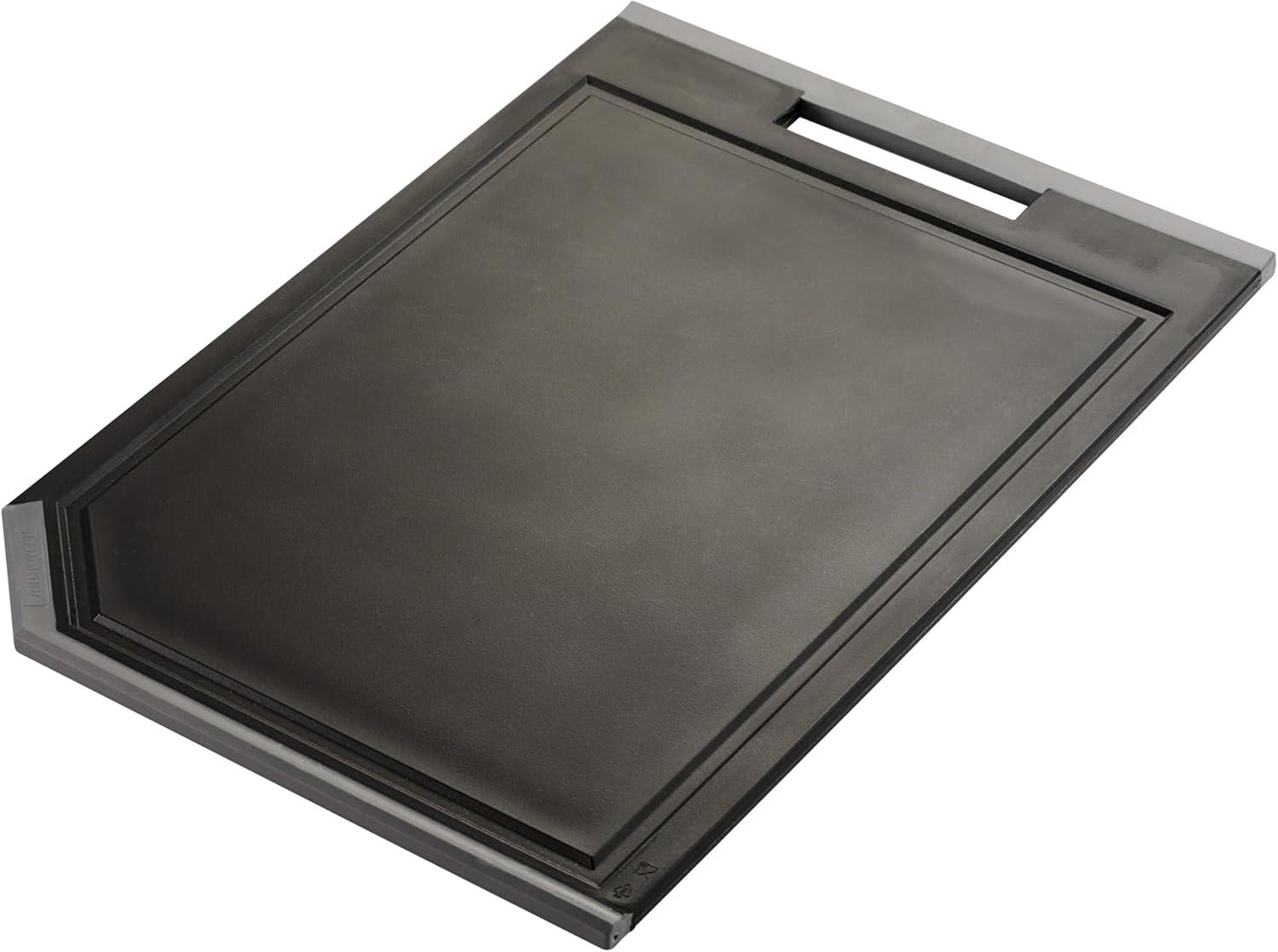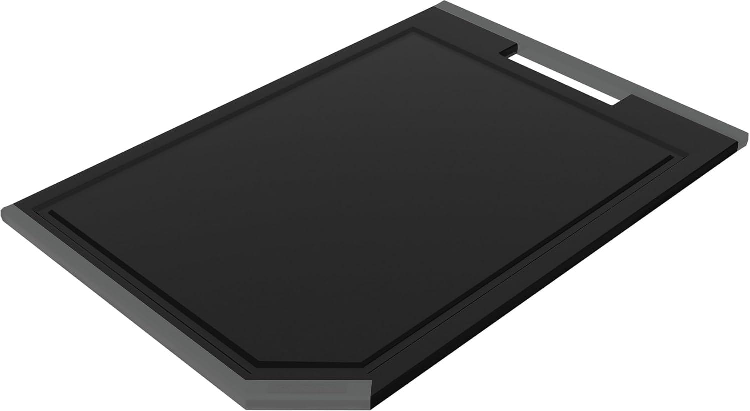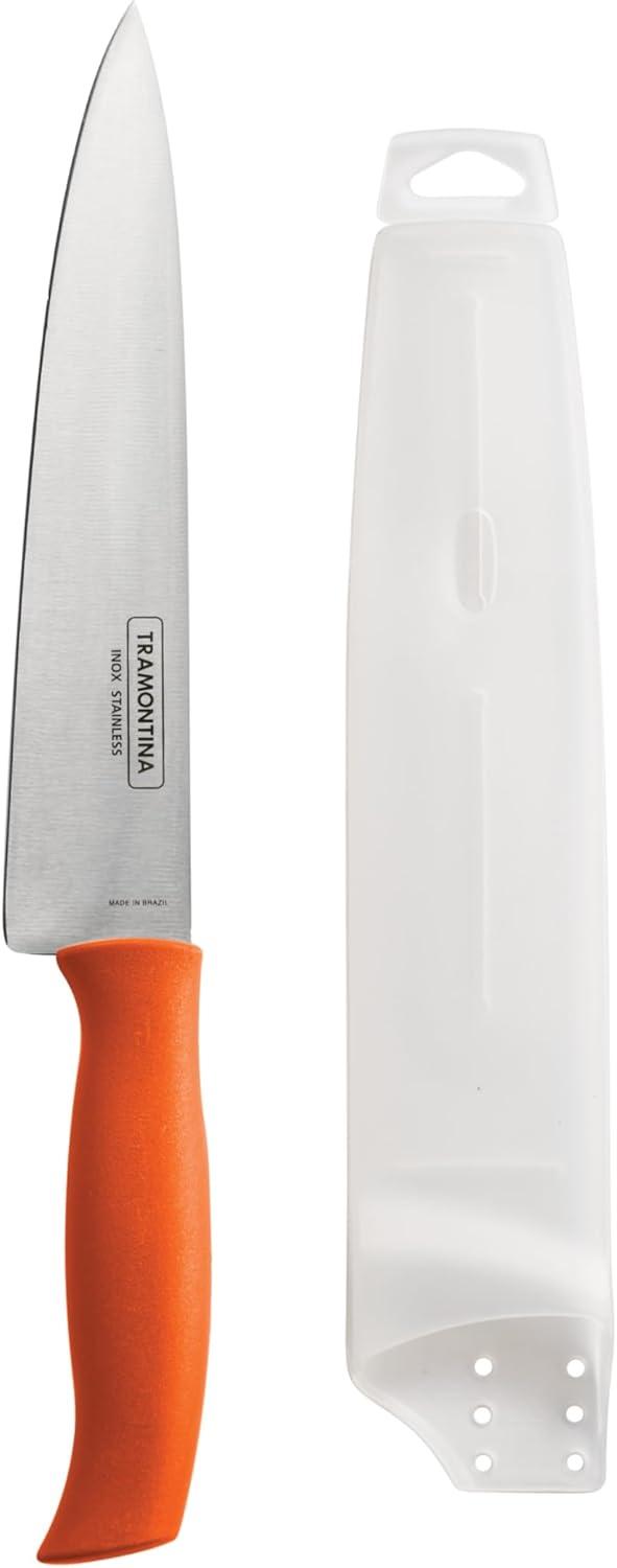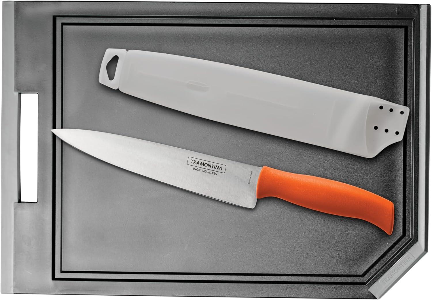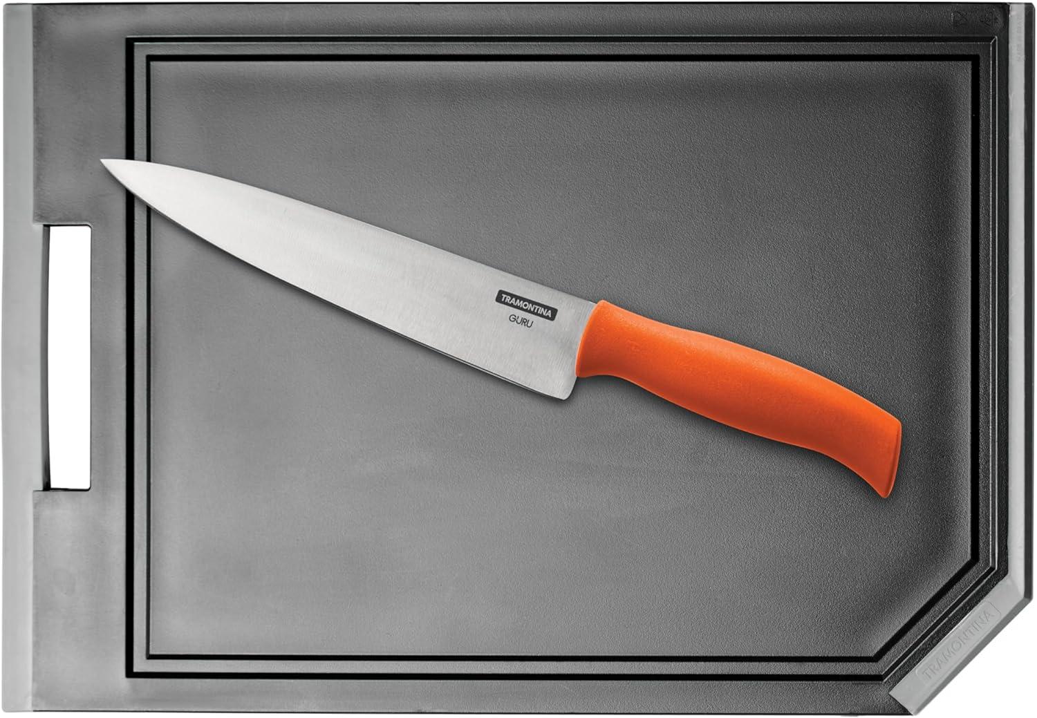 Before powering up your Guru smart induction cooktop, chop, slice, dice and mince your ingredients quickly and easily with the Guru Essential Knife and Cutting Board Prep Set. The 8 in chef's knife, constructed from tough, corrosion-resistant AISI 420 stainless steel, features a durable, molded grip and a plastic blade protector to maintain a sharp cutting edge. The 17 in X 12 in black polypropylene cutting board features a juice groove to keep your work surface clean and tidy, and a built-in handle with a comfortable thermoplastic rubber grip. Made in Brazil and China.