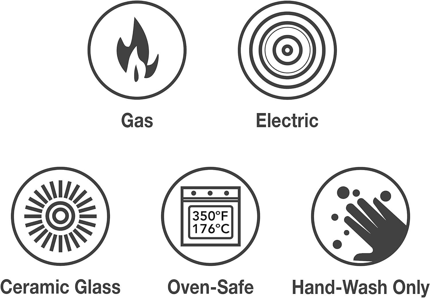 Versatile & Oven-Safe: Compatible with gas, electric, and ceramic glass cooktops (not induction) and oven-safe up to 350°F (176°C). Hand-wash only for long-lasting performance.