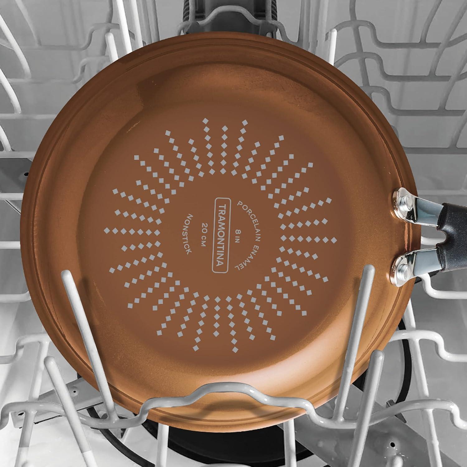 The Tramontina 3 Pk Fry Pans set solves the frustration of food sticking and requires little oil for cooking. Each lightweight fry pan has stamped even-gauge construction and a porcelain enamel exterior finish. The reinforced nonstick TeflonTM interior finish is perfect for frying eggs, making grilled cheese sandwiches, and other hot foods that can easily slide from pan to plate without sticking. It also helps make cleaning the 8 in, 10 in, and 12 in fry pans easier than typical fry pans. Each size pan in the Tramontina 3 Pk Fry Pans set has long black handles with a soft grip silicone and gives you plenty of cooking options. Available in a variety of stylish colors.