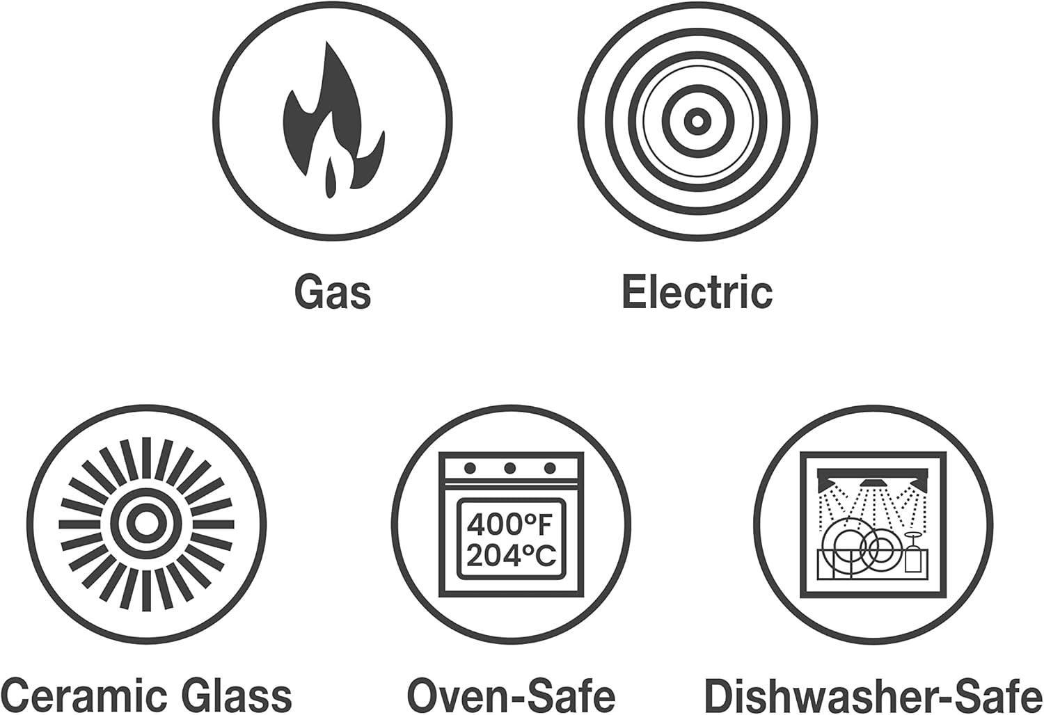 Cooktop & Oven Compatible: Safe for gas, electric, and ceramic glass cooktops (not induction) and oven-safe up to 350°F / 176°C for added versatility.