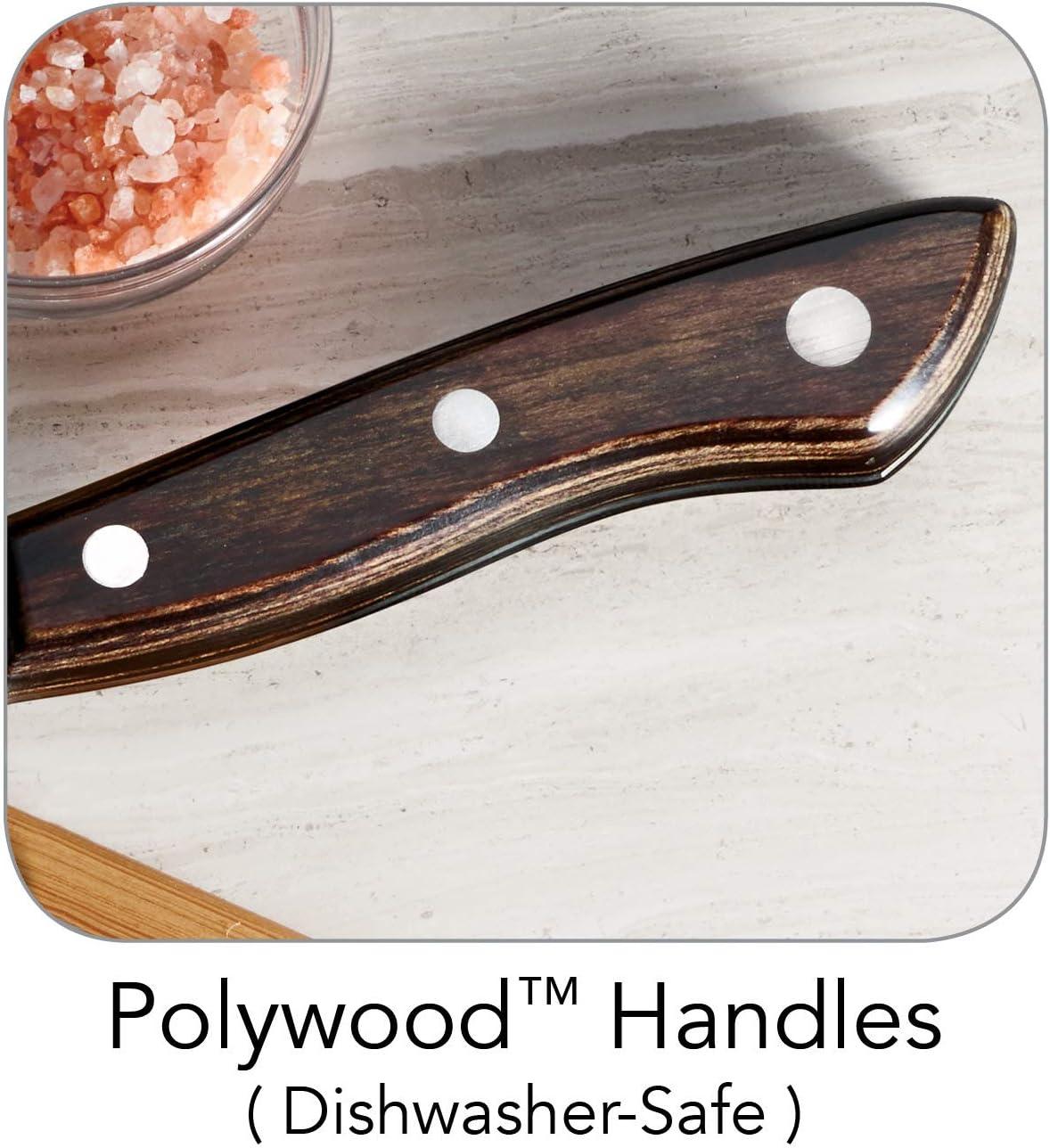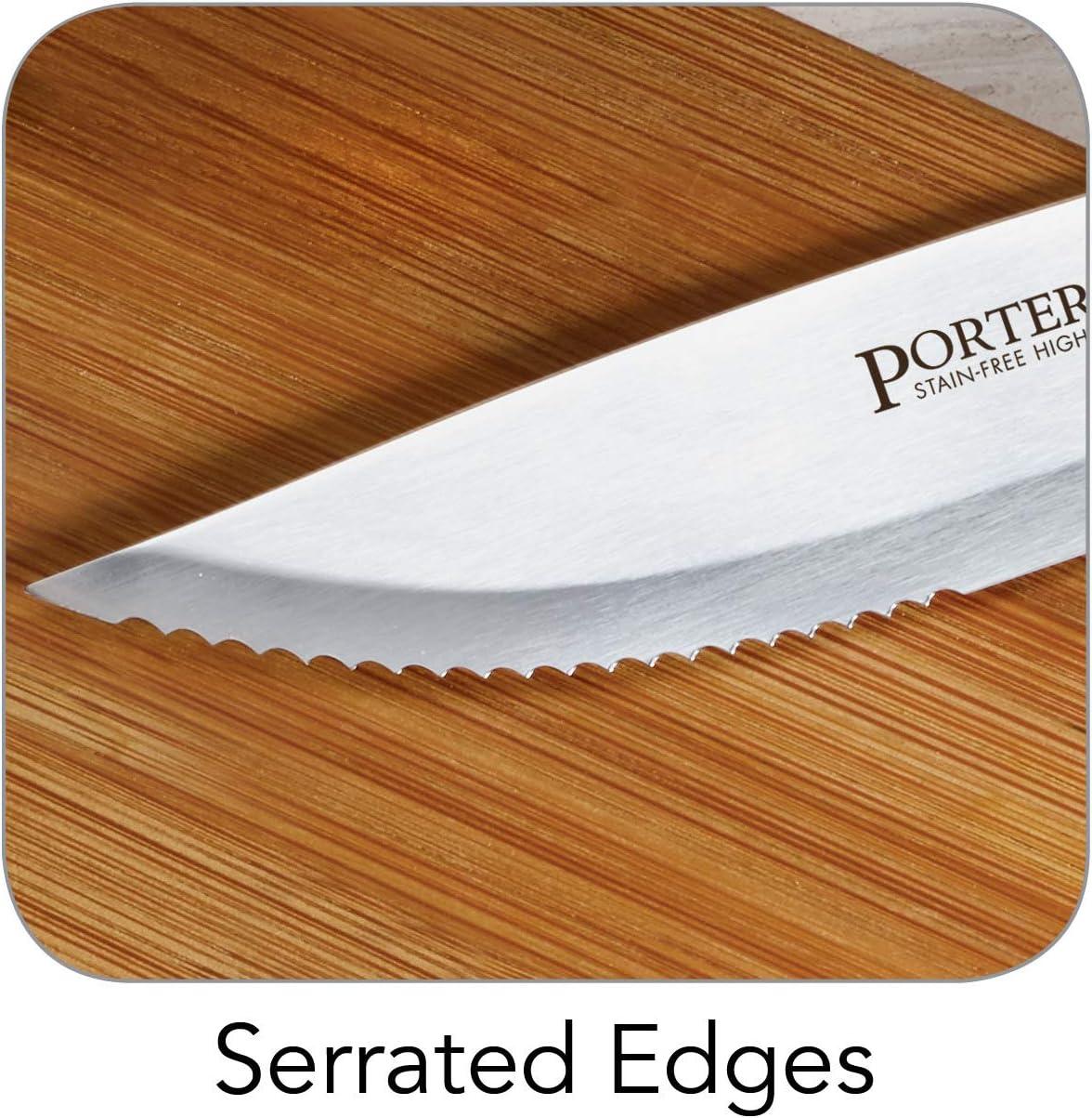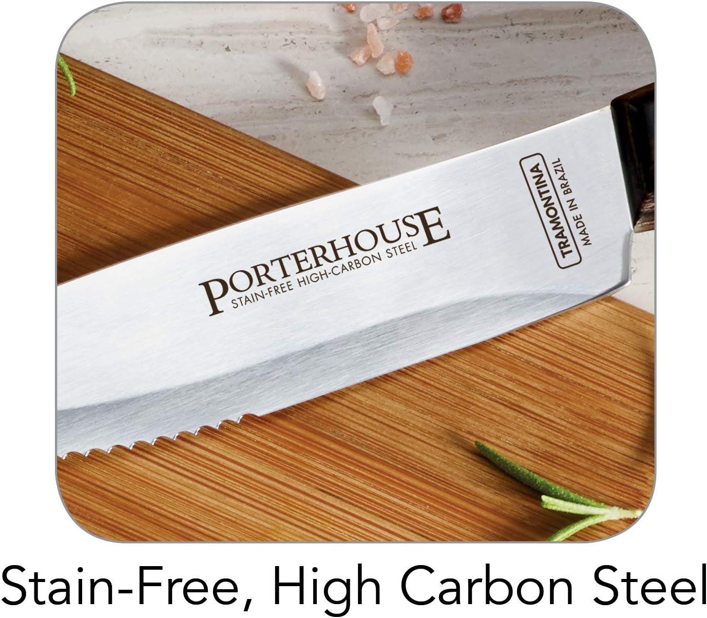 Tramontina's Pointed Polywood Porterhouse Steak Knives are ideal for creating a steakhouse ambiance, as well as exceptional sharpness, quality construction, and durability, when entertaining guests or eating dinner with the family. The stain-free, high carbon steel, serrated blades of the Porterhouse knives effortlessly slice through savory steaks and other cooked meats, while the dishwasher-safe, dark brown Polywood handles allow for easy cleanup. The set includes 8 Porterhouse Steak Knives that are made in Brazil and offered under a Lifetime Warranty.