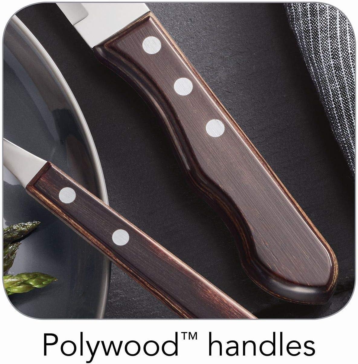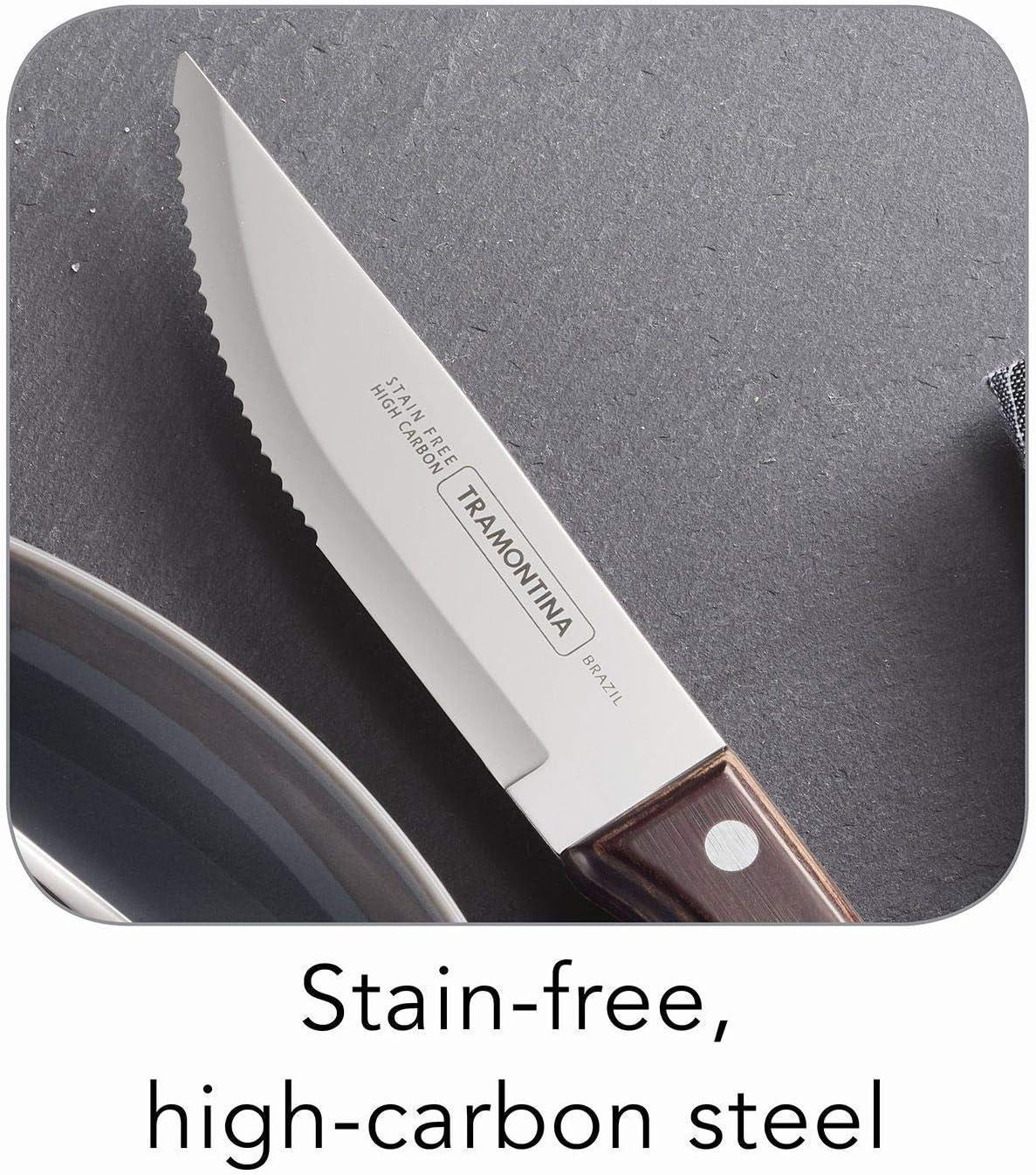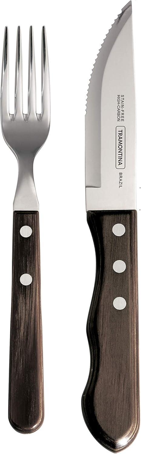 Tramontina's Porterhouse 12 Pc Polywood Steak Knife and Fork Set is great for creating a steak house ambience when dining with friends for family. The set includes 6 Porterhouse steak knives and 6 dinner forks with attractive Polywood handles that are easy to clean. The high-carbon, stainless steel, serrated blades with a pointed tip provides effortless cutting for steak and chops, while the forks' Polywoodâ„¢ handles compliments the knives perfectly on your table. Made in Brazil.