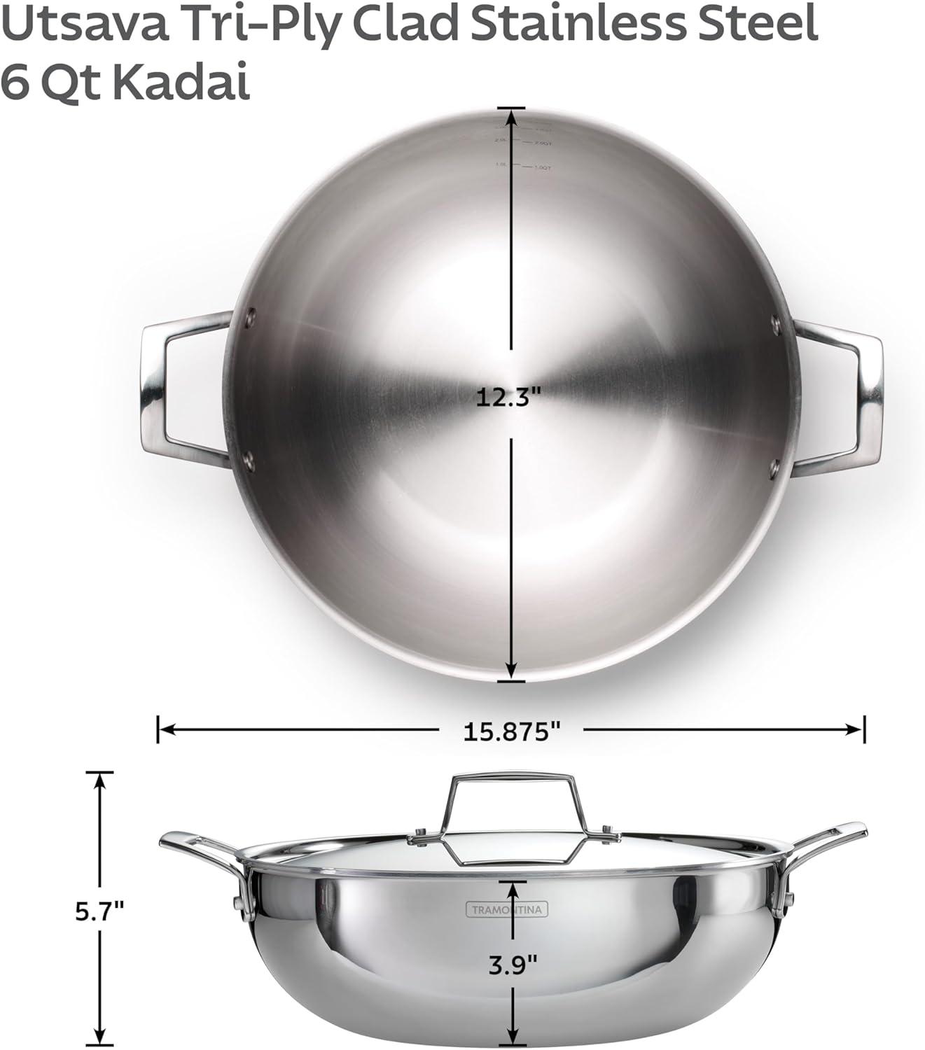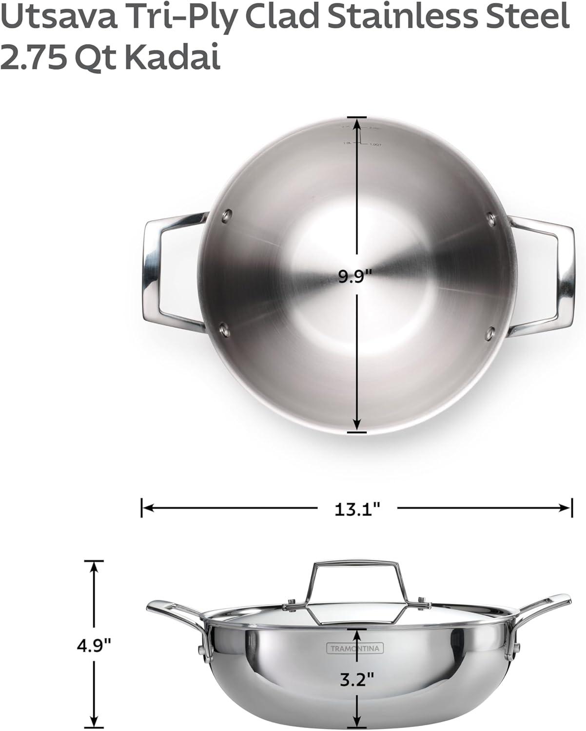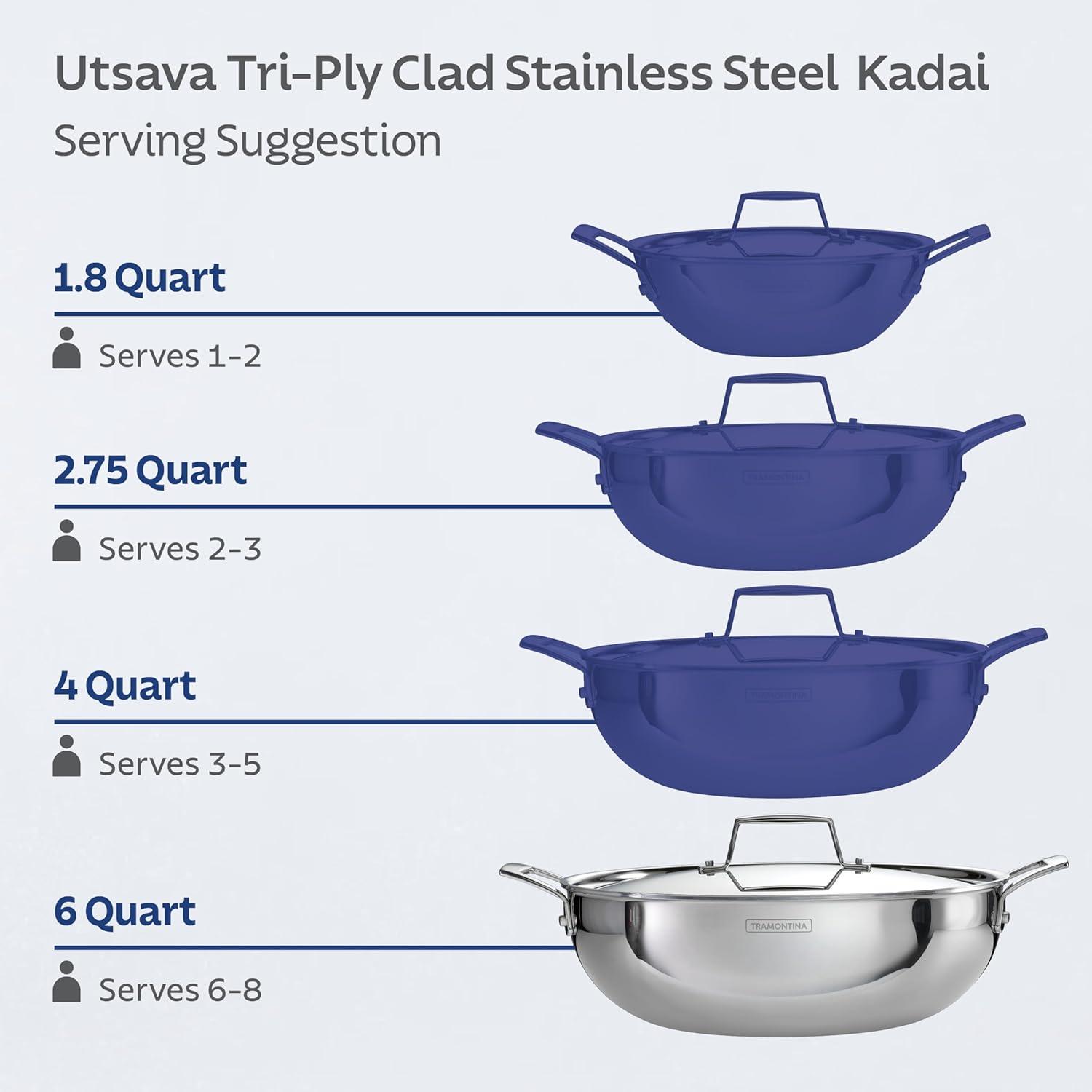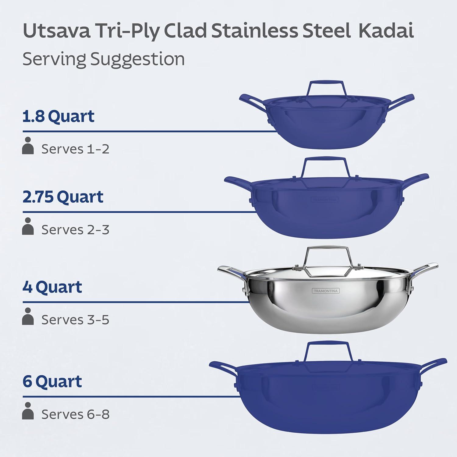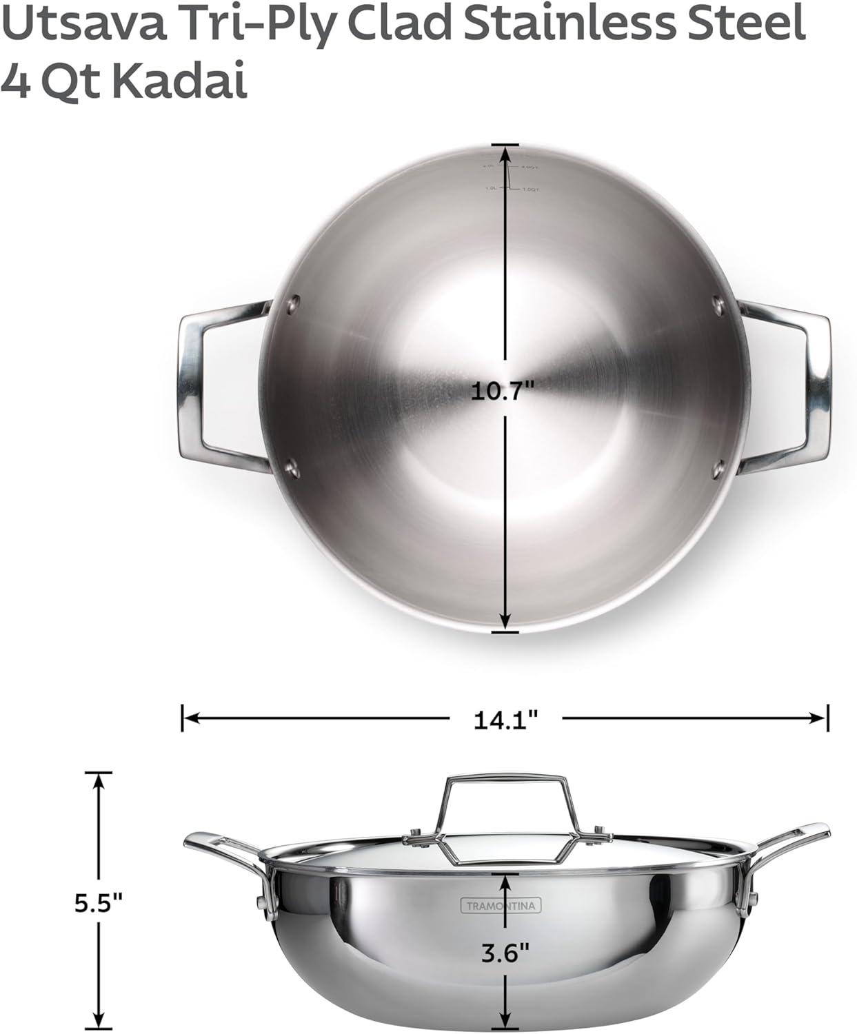 Celebrate every gathering with the Tramontina Utsava 4 Qt Kadai, where tradition meets modern craftsmanship. This kadai’s tri-ply clad construction ensures even heating, making every meal a masterpiece. Perfect for larger dishes like hearty stews, biryanis, or deep-fried treats, the 4 Qt capacity serves 4-5 people, ideal for family dinners and festive occasions. With its elegant mirror-polished exterior and satin interior, the Utsava Kadai shines in your kitchen, adding both beauty and functionality. Designed to work on all cooktops, including induction, and oven-safe up to 500°F, the Utsava Kadai is as versatile as it is stylish. The precision-cast stainless steel handles provide a secure grip, allowing you to move easily from stovetop to table. Convenient quart and liter markings inside the pan make cooking effortless, so you can focus on creating dishes that bring everyone together. NSF certified and backed by a lifetime warranty, this kadai is built to elevate your cooking experiences.
