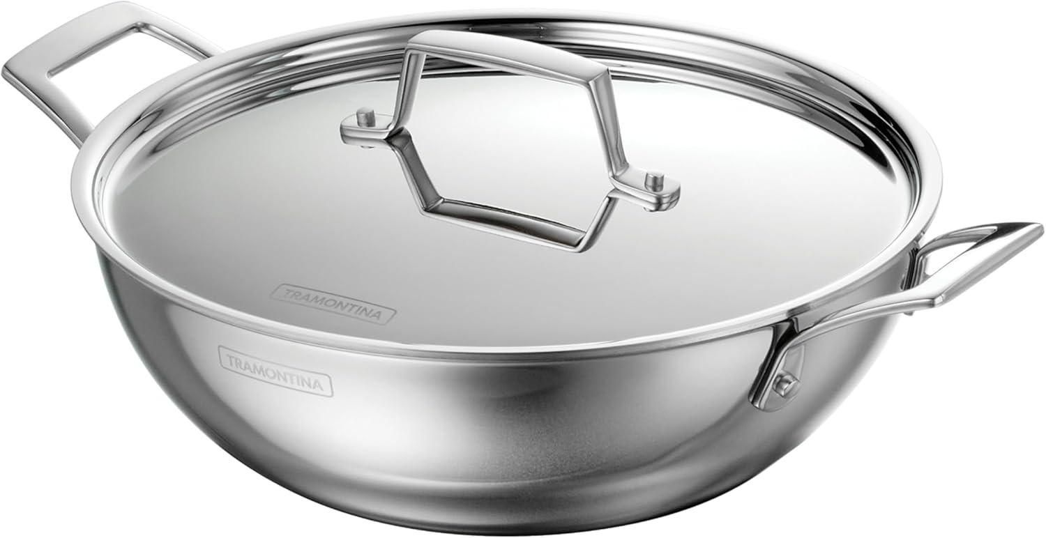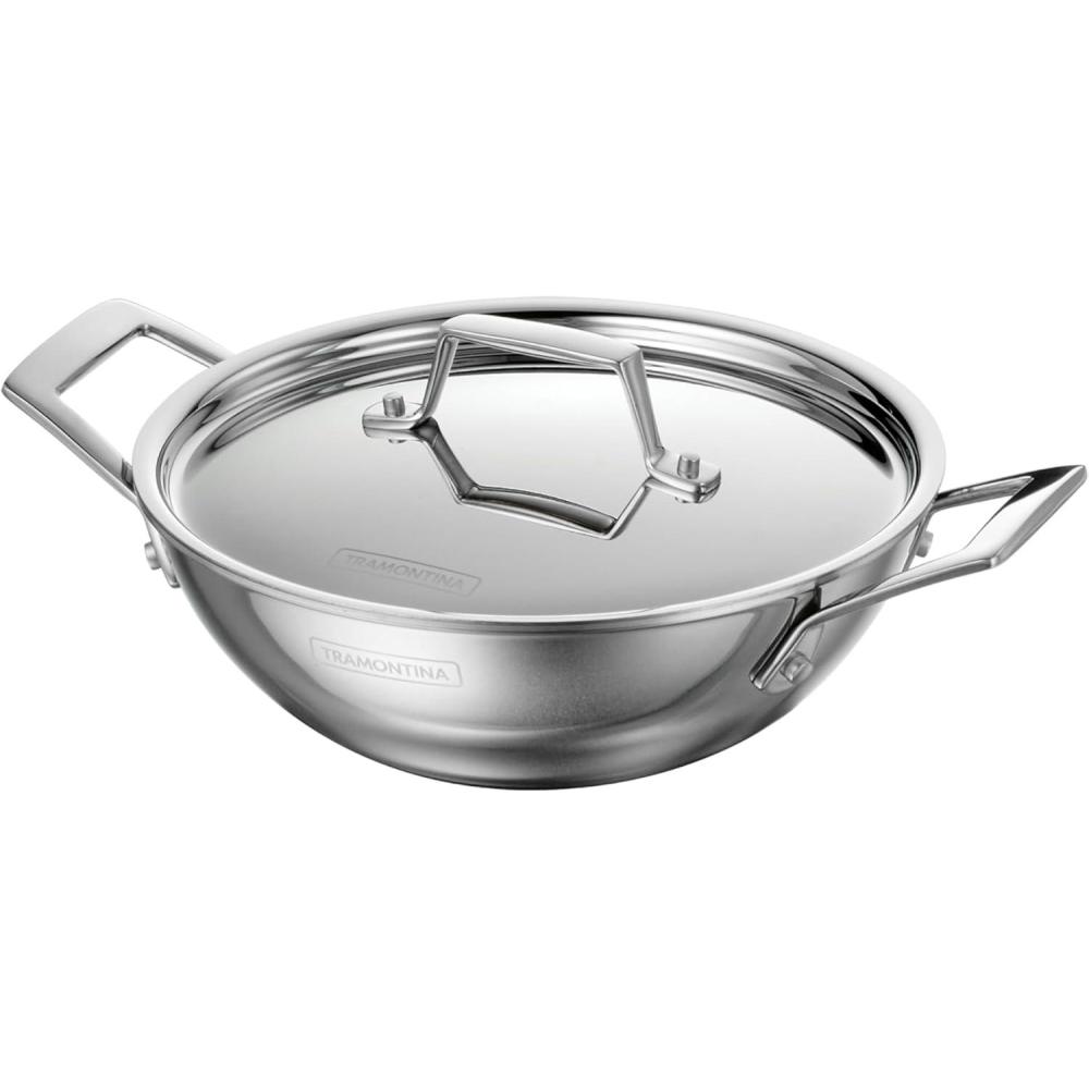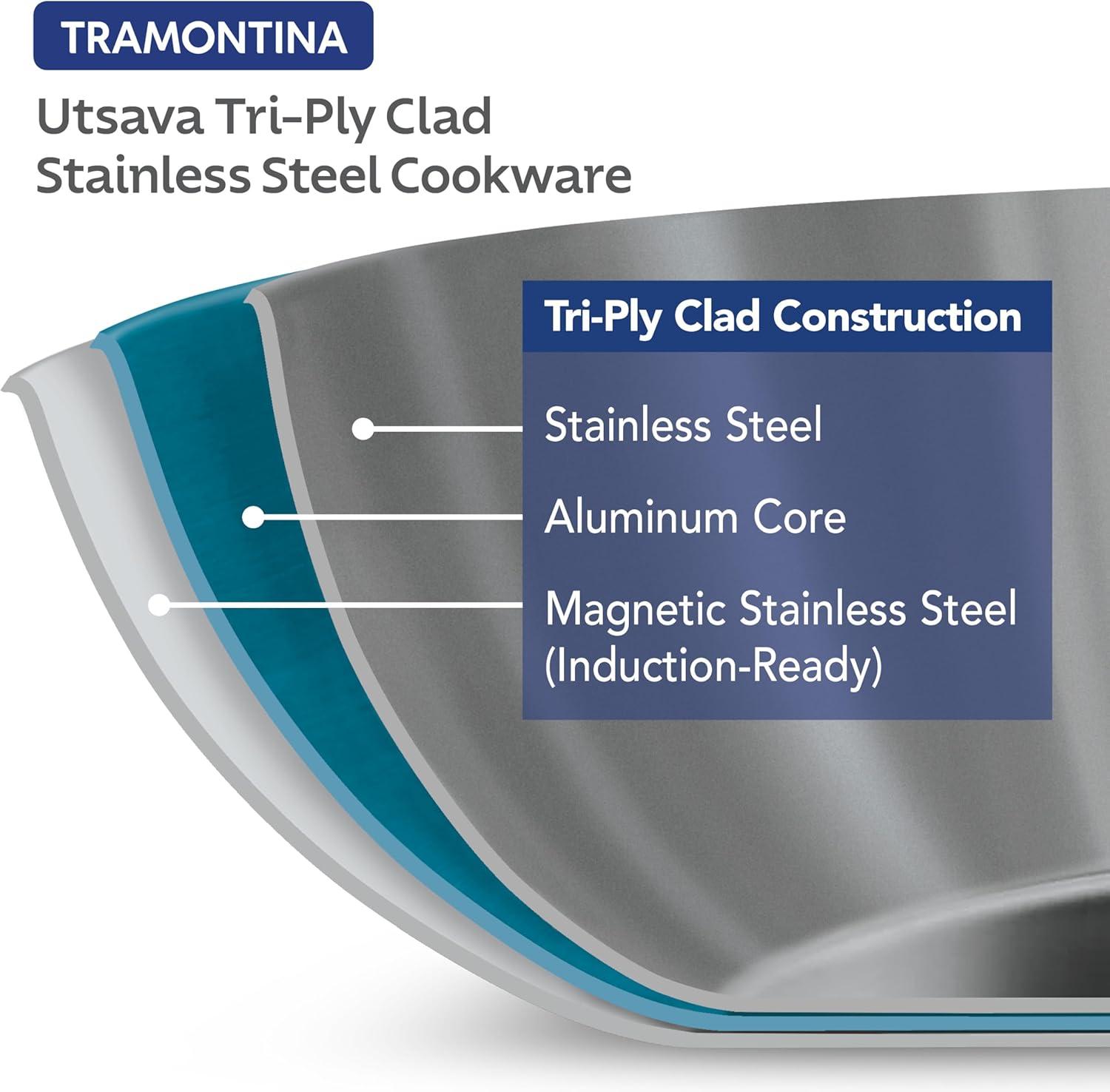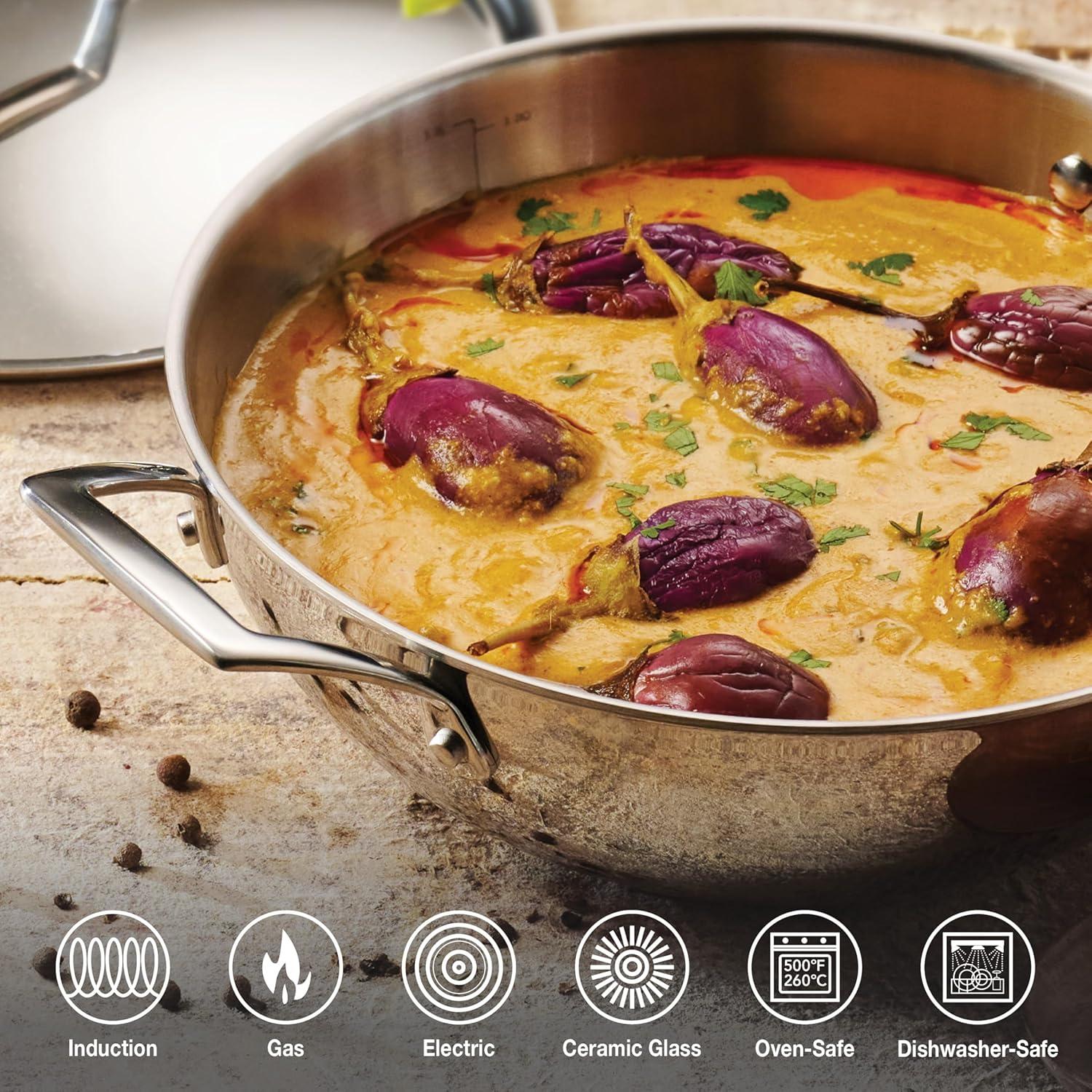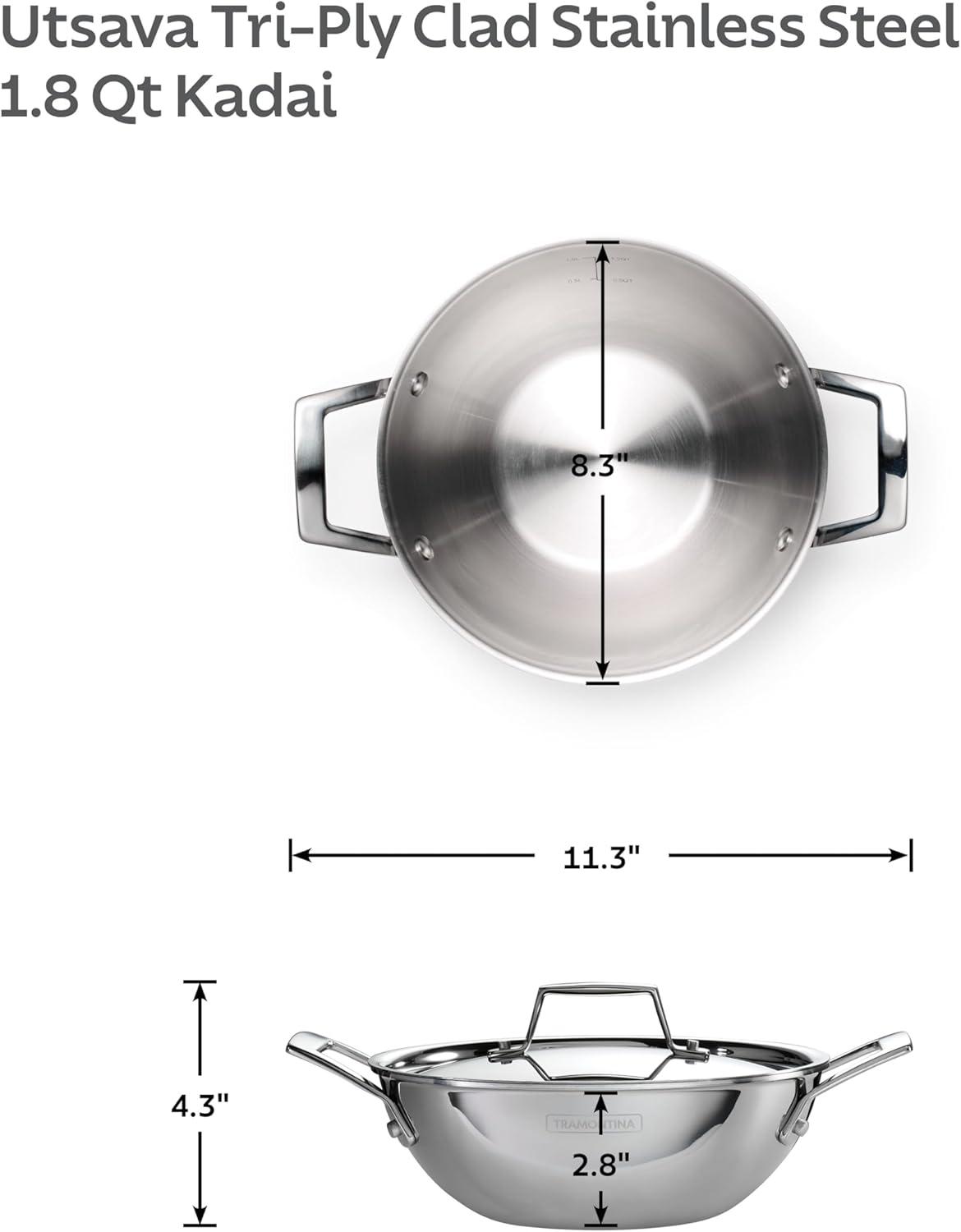 Celebrate every gathering with the Tramontina Utsava 4 Qt Kadai, where tradition meets modern craftsmanship. This kadai’s tri-ply clad construction ensures even heating, making every meal a masterpiece. Perfect for larger dishes like hearty stews, biryanis, or deep-fried treats, the 4 Qt capacity serves 4-5 people, ideal for family dinners and festive occasions. With its elegant mirror-polished exterior and satin interior, the Utsava Kadai shines in your kitchen, adding both beauty and functionality. Designed to work on all cooktops, including induction, and oven-safe up to 500°F, the Utsava Kadai is as versatile as it is stylish. The precision-cast stainless steel handles provide a secure grip, allowing you to move easily from stovetop to table. Convenient quart and liter markings inside the pan make cooking effortless, so you can focus on creating dishes that bring everyone together. NSF certified and backed by a lifetime warranty, this kadai is built to elevate your cooking experiences.