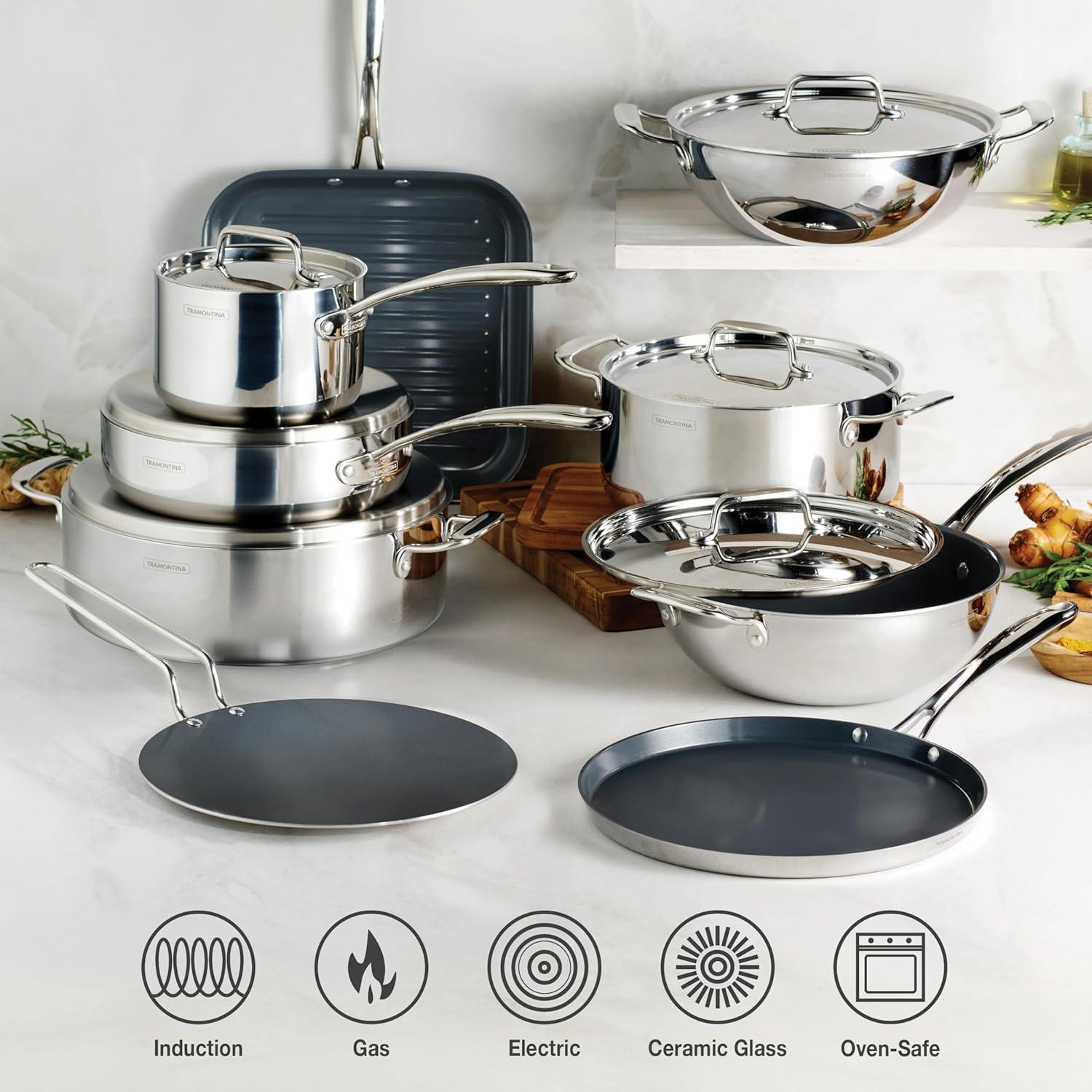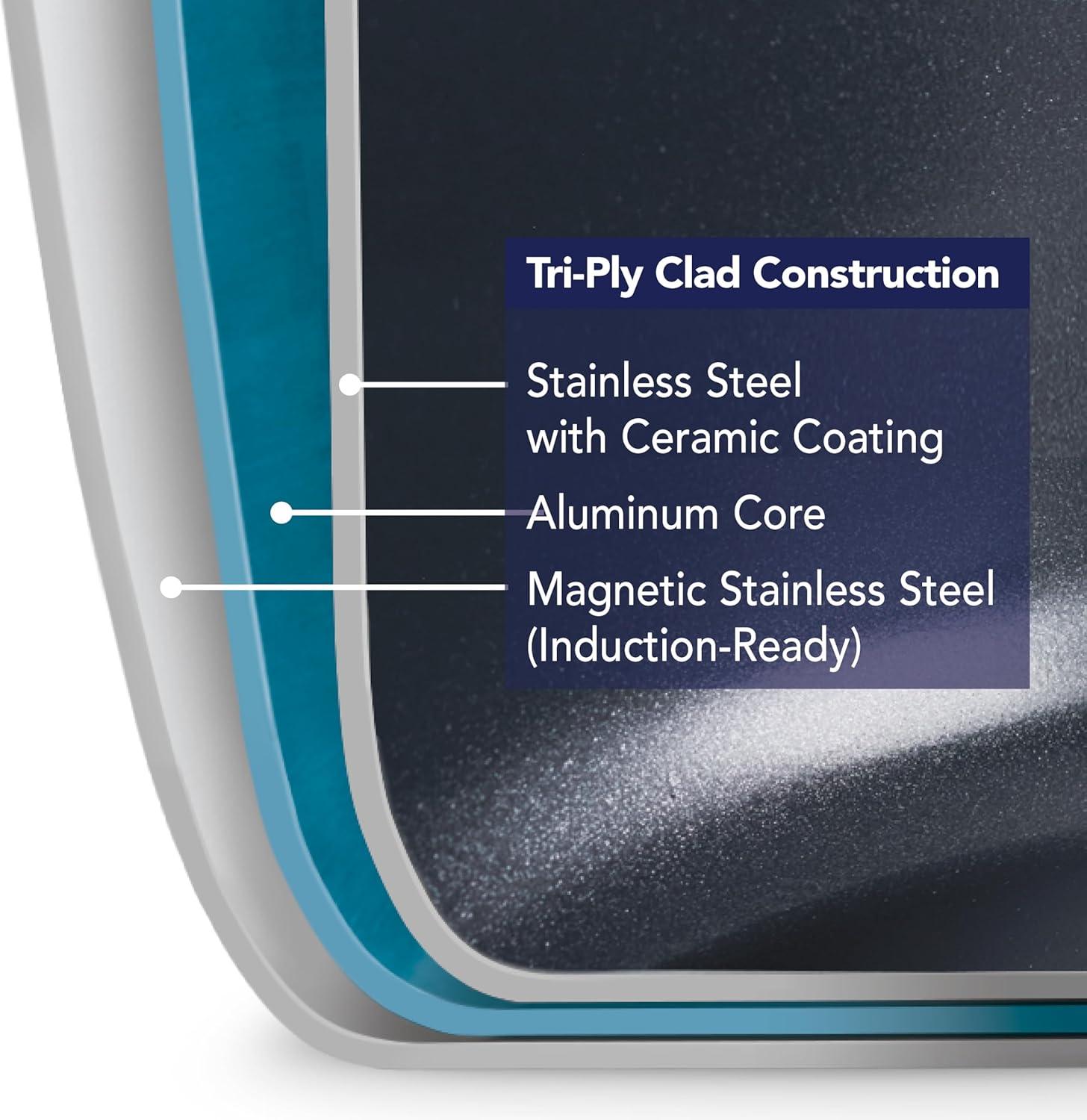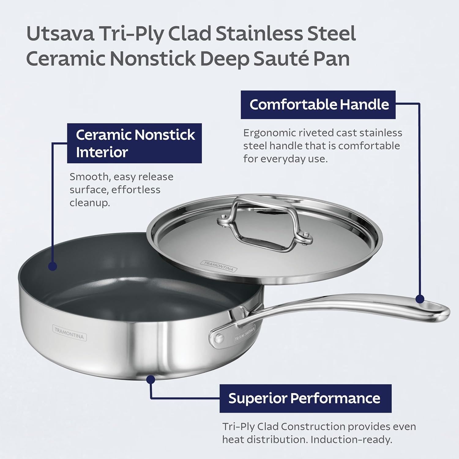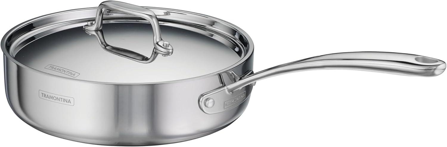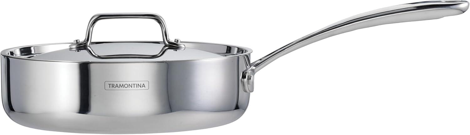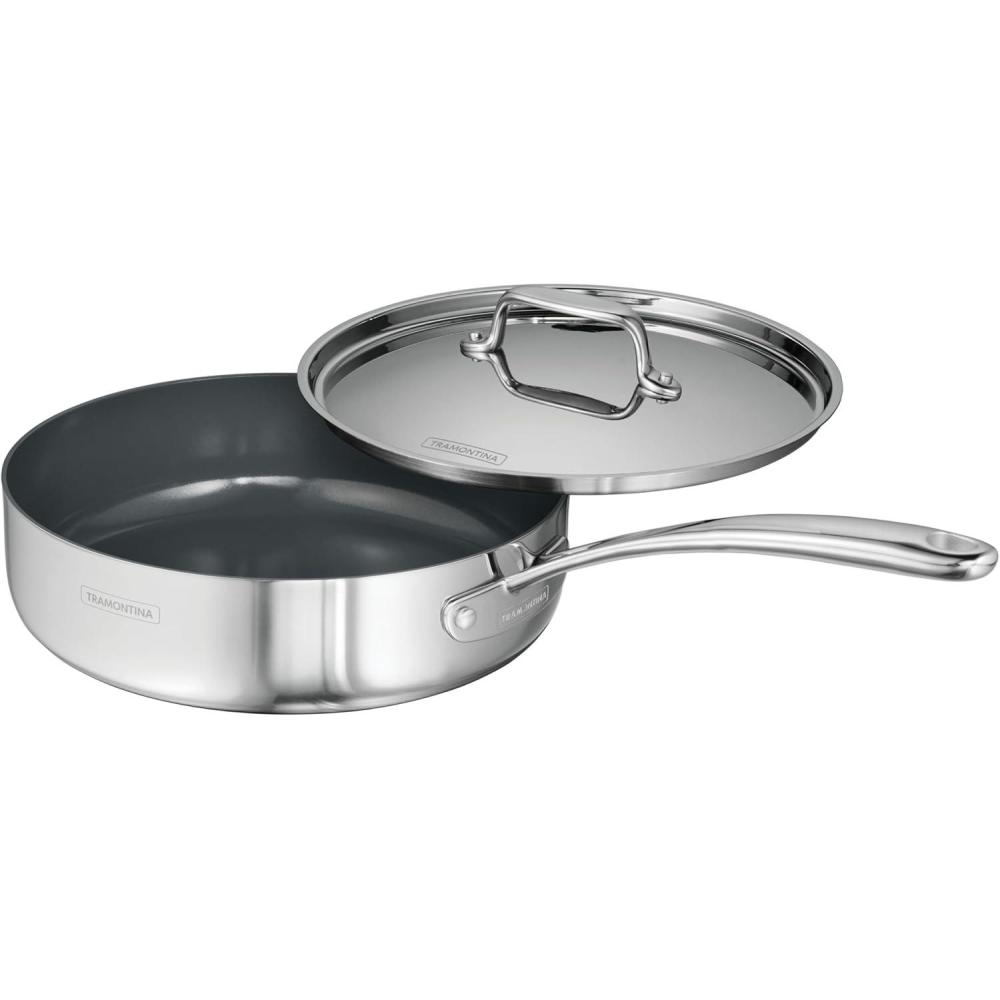 The Tramontina 2.9-Quart Saute Pan is a kitchen workhorse, combining professional performance with effortless nonstick convenience. Engineered for superior results, this all-clad pan is built with Tri-Ply Clad Stainless Steel—featuring a fast-heating aluminum core nestled between durable stainless steel layers—to guarantee quick and even heat distribution across the entire cooking surface. The interior is finished with a smooth, high-quality ceramic nonstick coating, which ensures easy food release and effortless cleanup for everyday cooking. The pan's high, straight sides make it ideal for deep-frying, braising, simmering sauces, or preparing one-pan meals without messy splatters, while the generous 2.9-quart capacity comfortably handles dishes for a small family. Designed for versatility, this cladded pan is compatible with gas, electric, ceramic glass, and induction cooktops and is oven-safe up to 500°F (260°C). It is dishwasher-safe for convenience, though handwashing is recommended to maintain the nonstick coating's longevity. This is the perfect pan for chefs seeking both durability and superior nonstick performance.