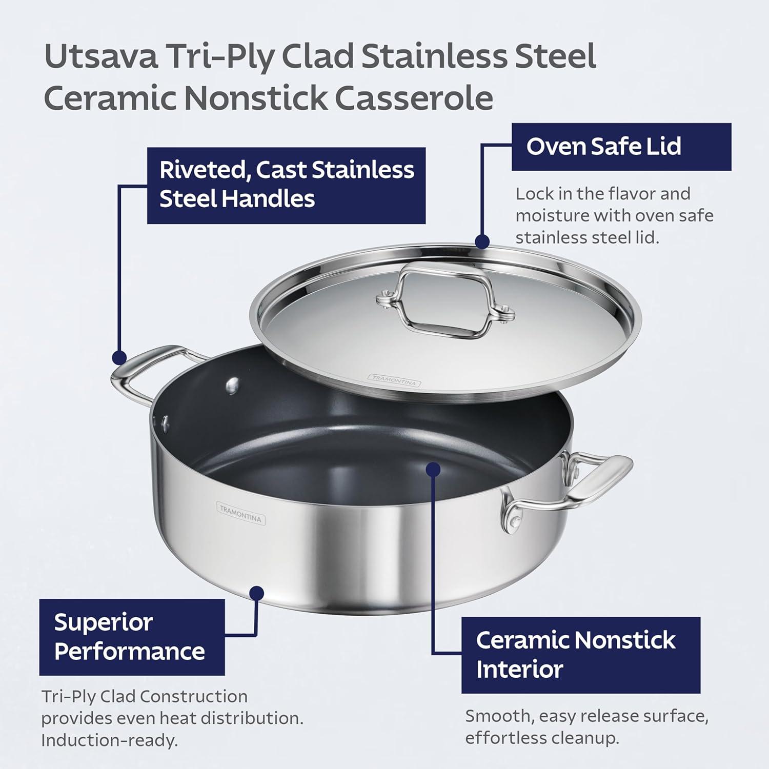 Tramontina Utsava Tri-Ply Clad Stainless Steel 3.25-Quart Casserole with Lid and Ceramic Non Stick Interior, Induction-Ready Small Dutch Oven Pot(Silver)