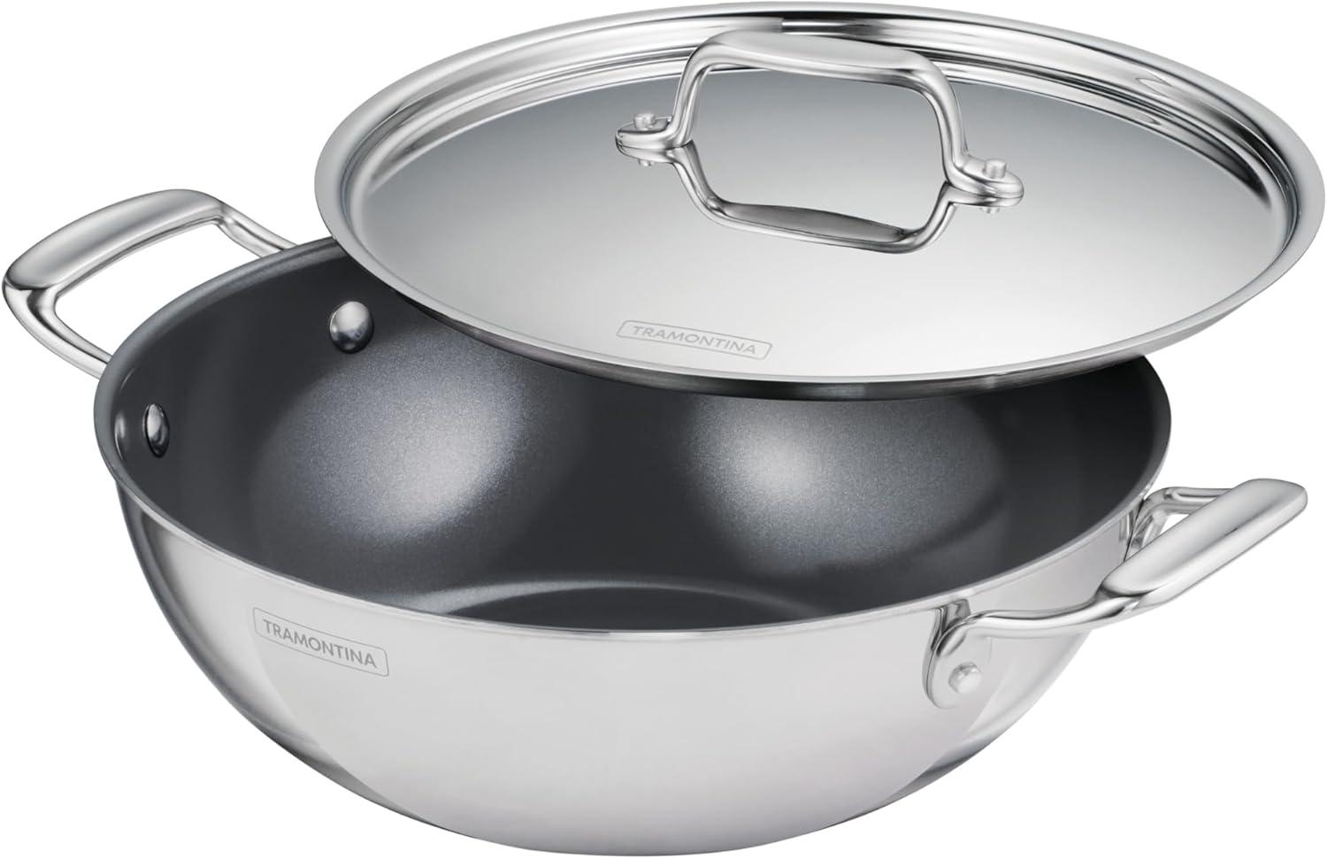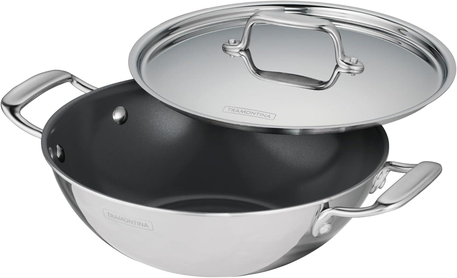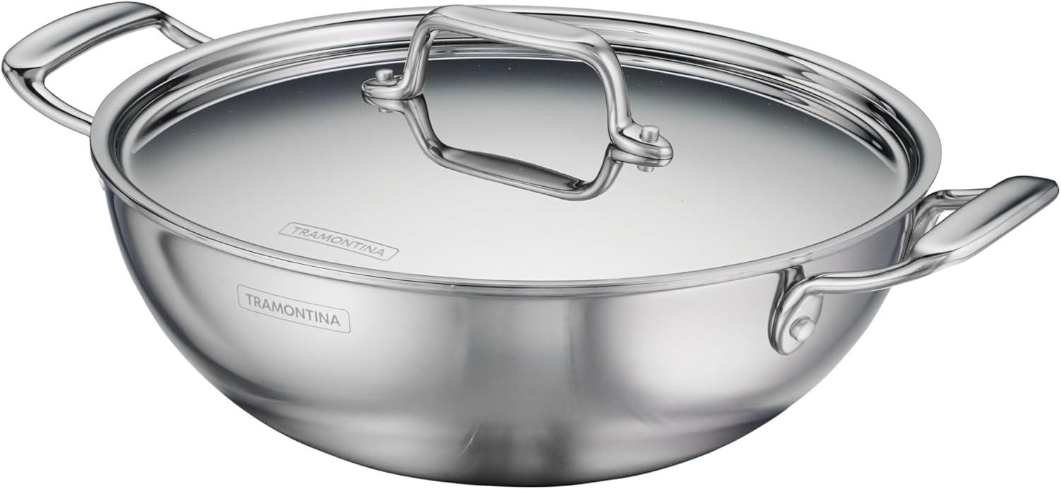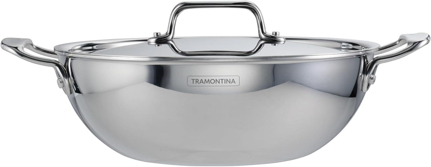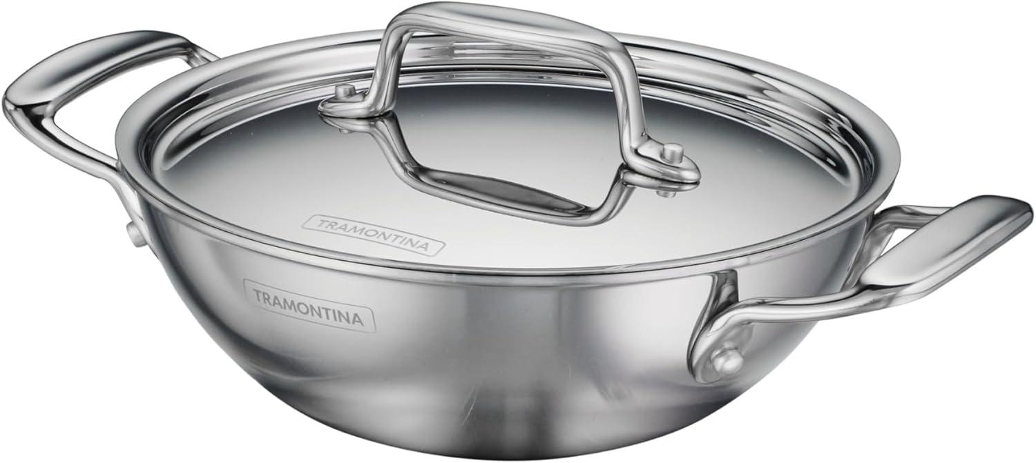 Tramontina Utsava Tri-Ply Clad Stainless Steel 4-Quart Kadai with Lid and Ceramic Non Stick Interior, Induction-Ready Large Kadhai Pot for Indian Cooking(Silver)