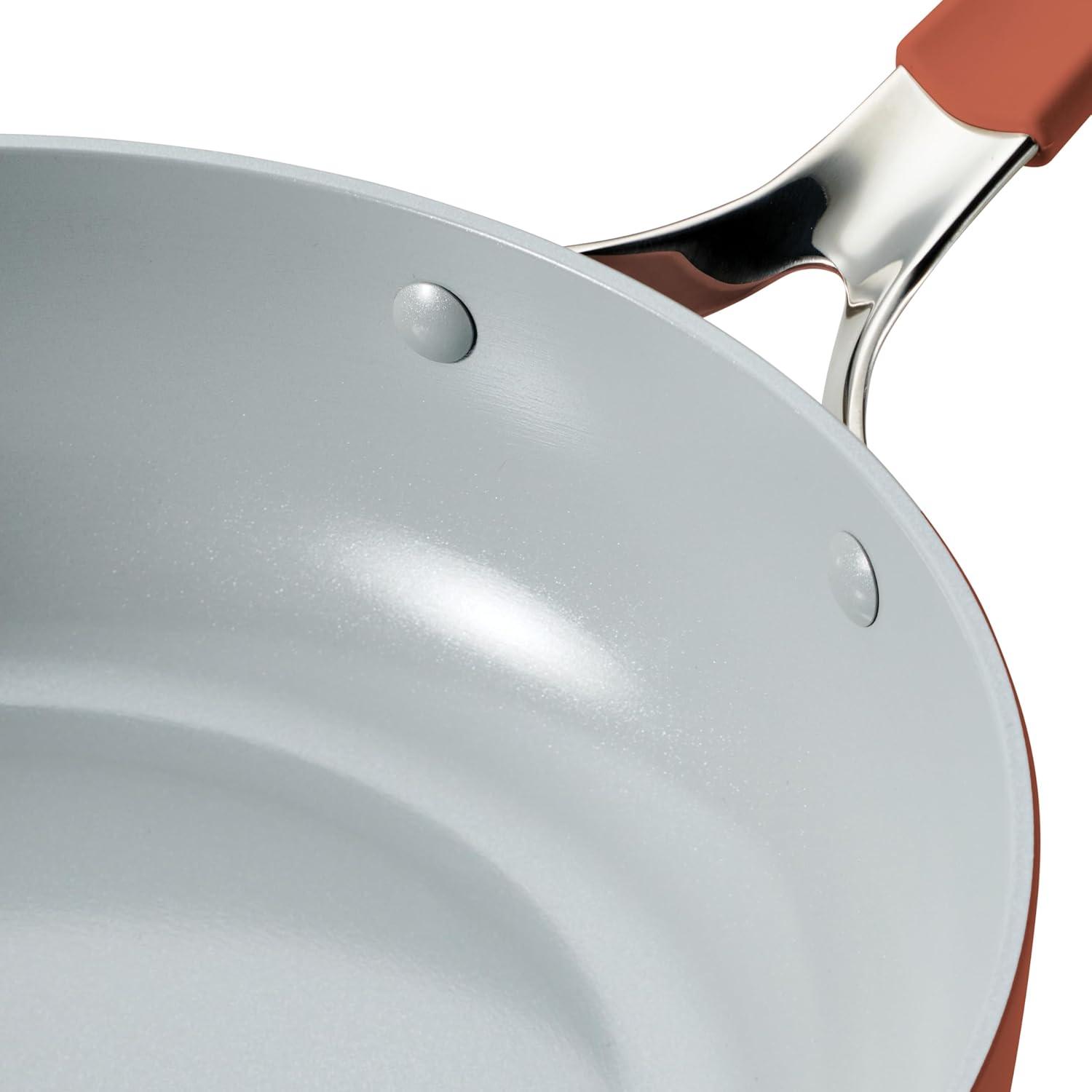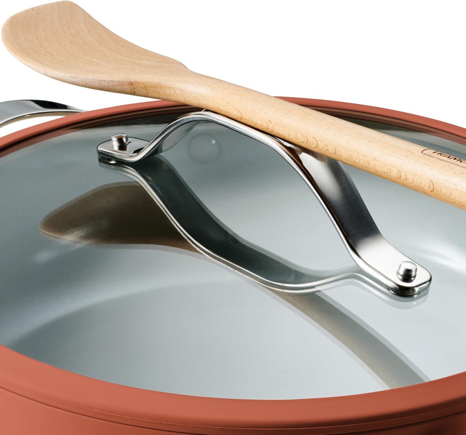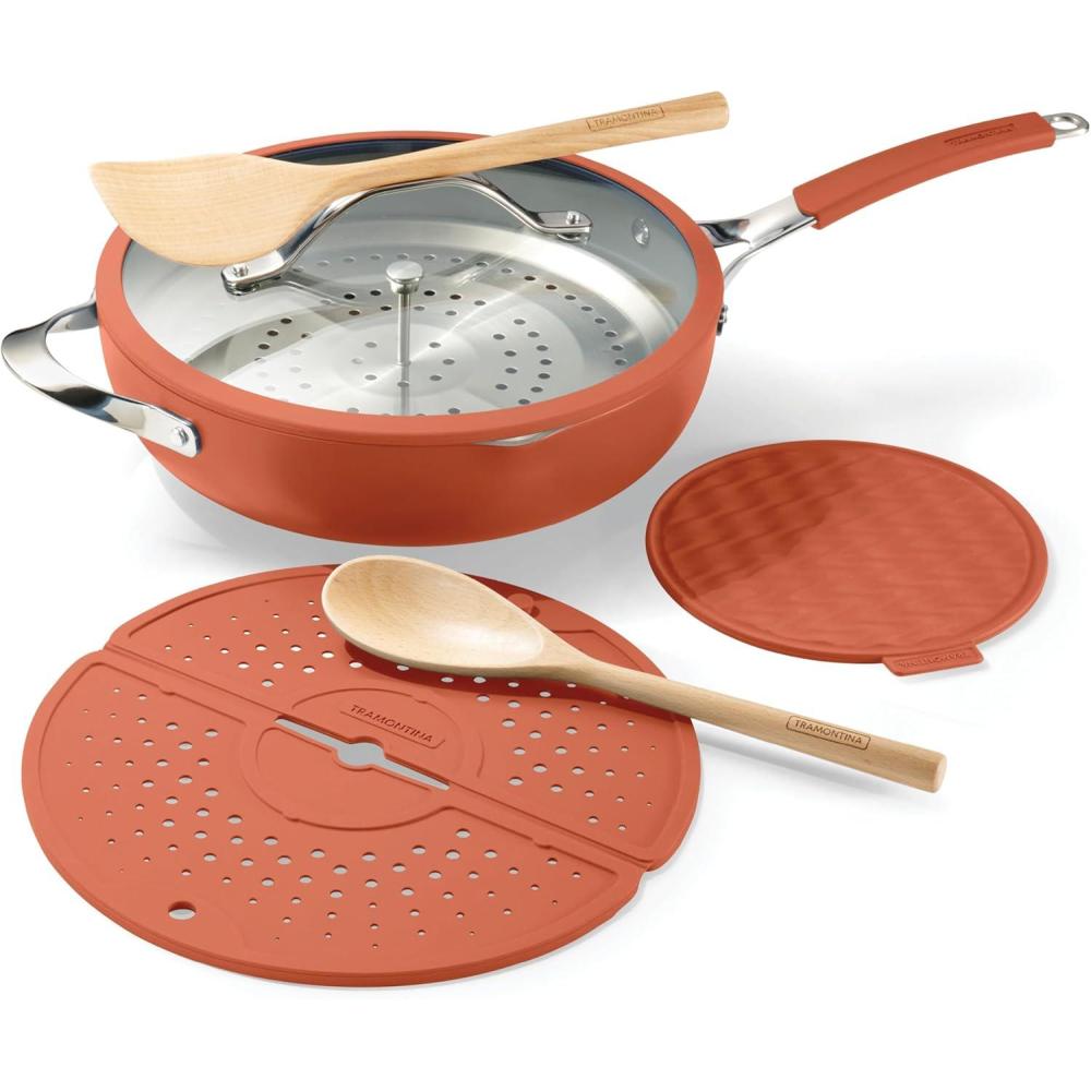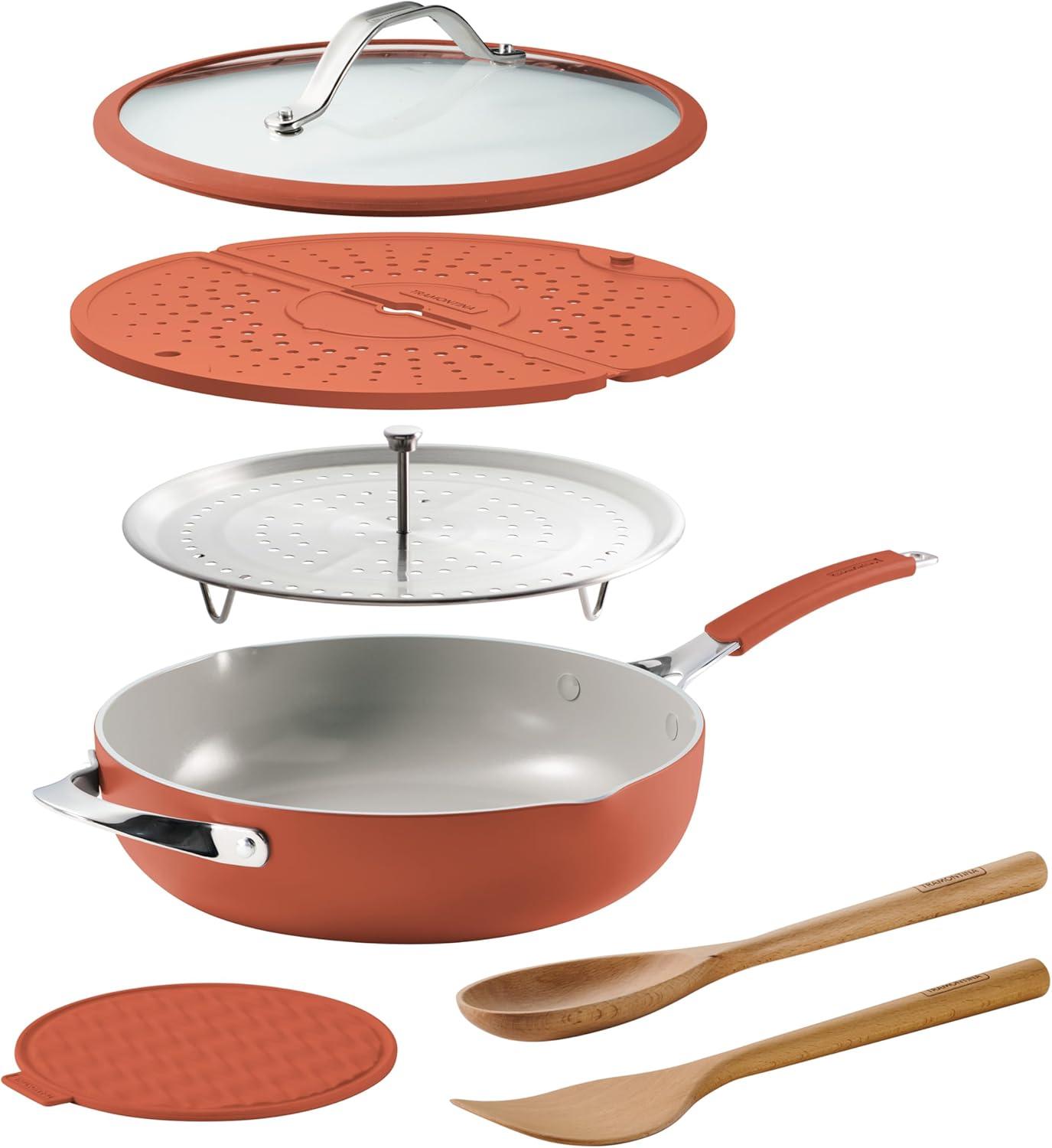 Tramontina Vue All-in-One Plus Pan Set, 5-Quart Ceramic Non Stick Cooking Pan with Glass Lid, Steamer Insert, Beechwood Utensils, Splatter Screen, Pot Holder, Green(Terracotta)